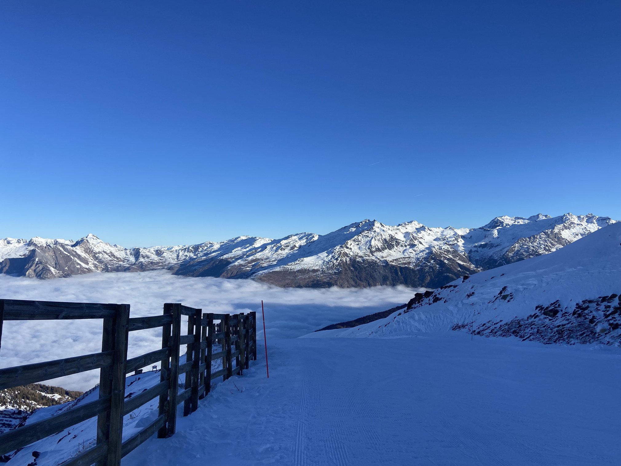 Retour à la case départ pour quelques descentes depuis le Grand Plateau (la neige était toujours correcte globalement) avant de basculer du côté de la Sétaz par Cornafond. C’est là qu’on est passé du soleil au brouillard 😱 Visibilité quasi nulle vers le bas de la piste, il vaut mieux bien connaître les pistes pour retrouver son chemin vers les remontées mécaniques 😅 Les pistes commençaient aussi à être lustrées par endroits.