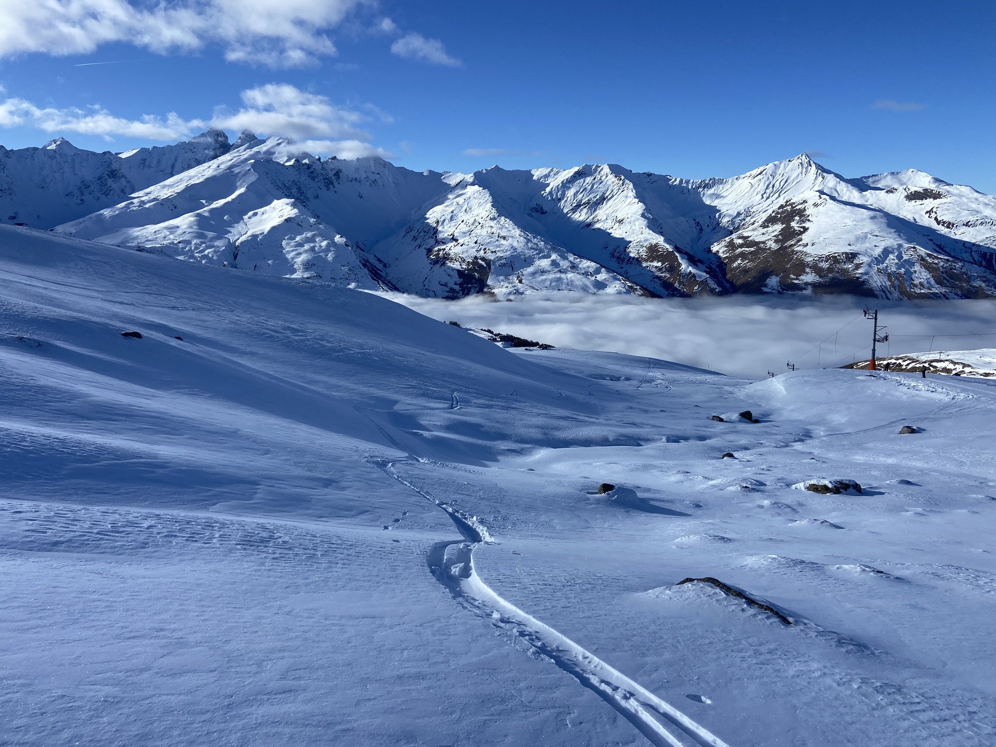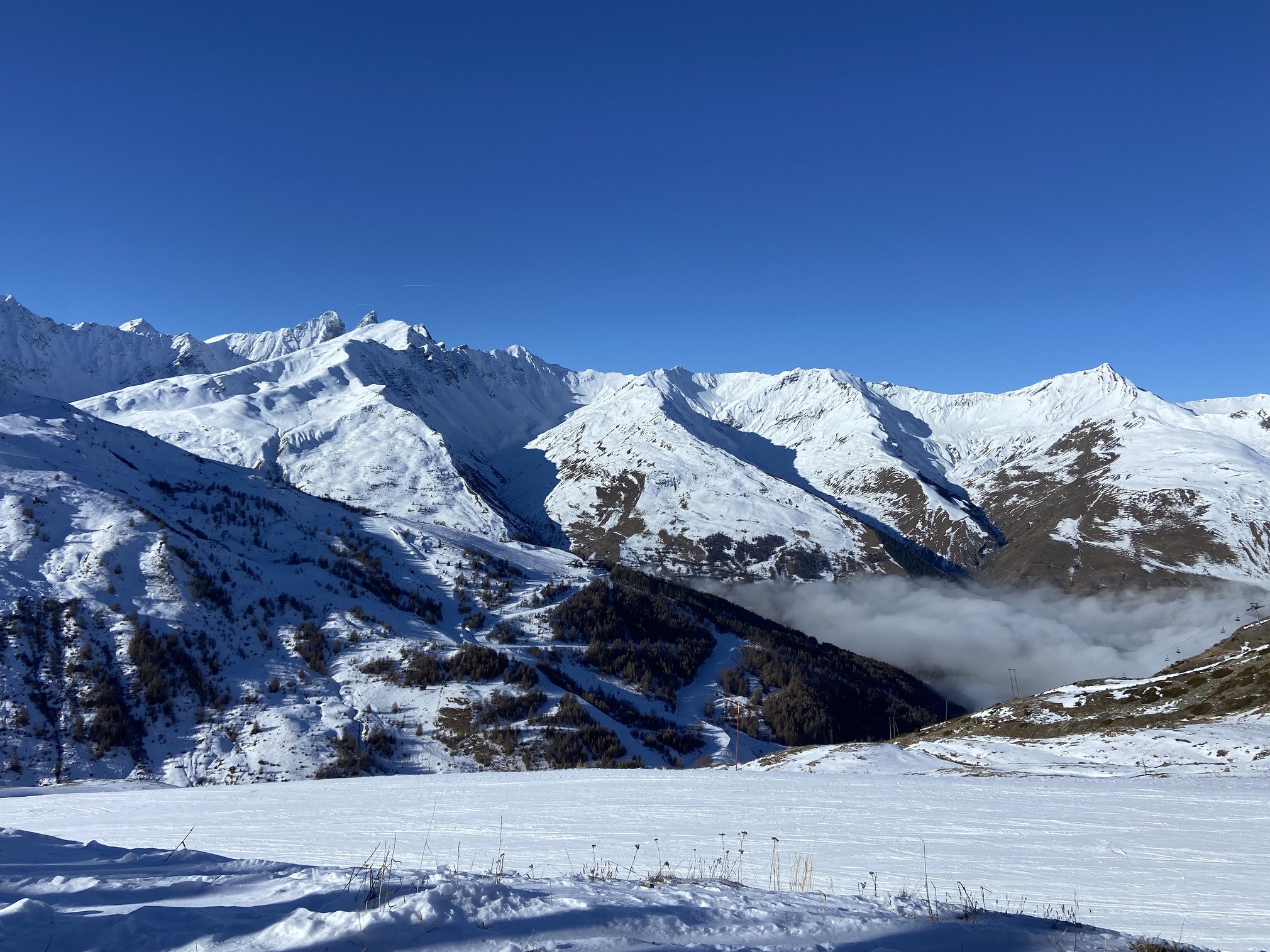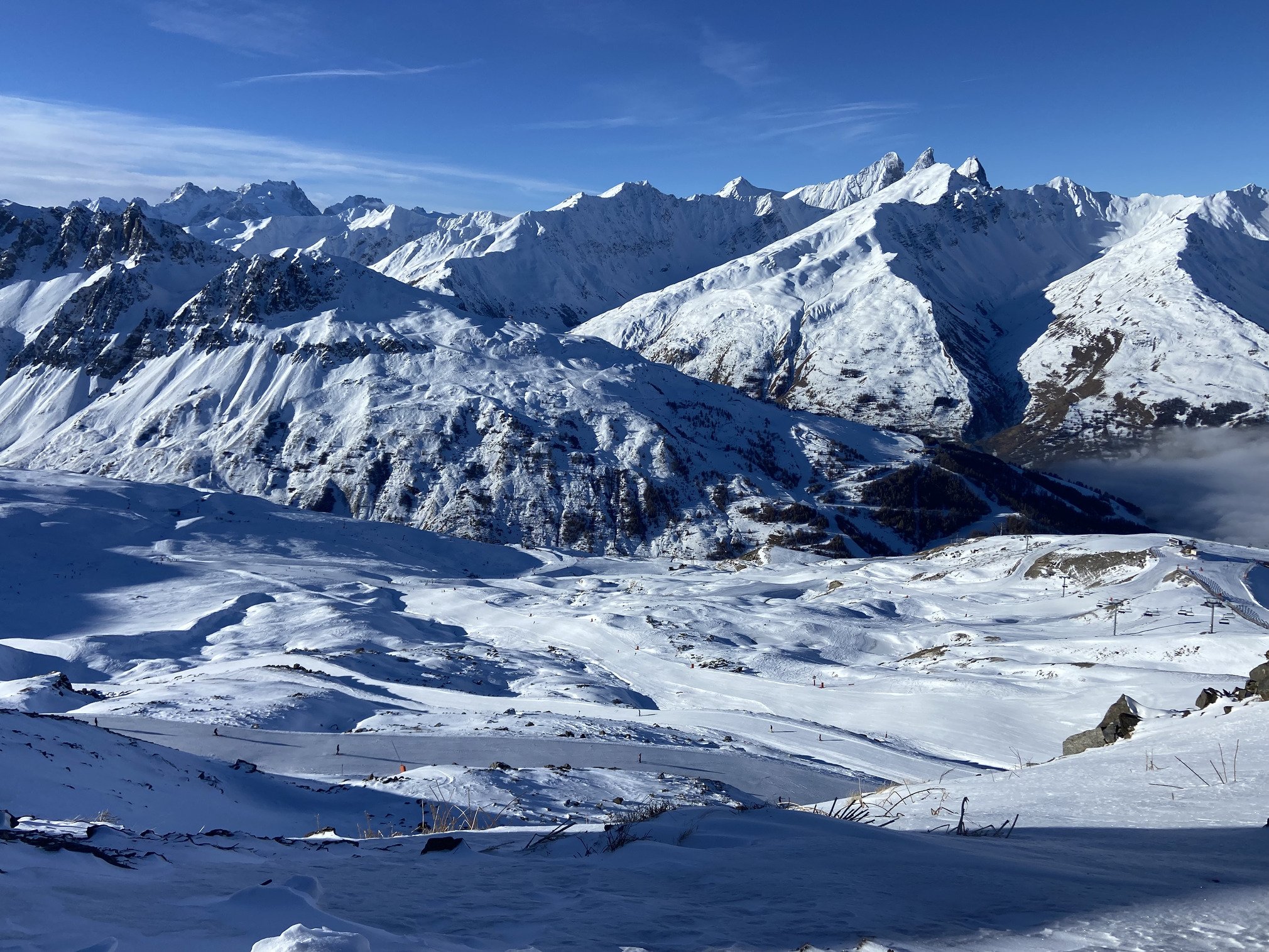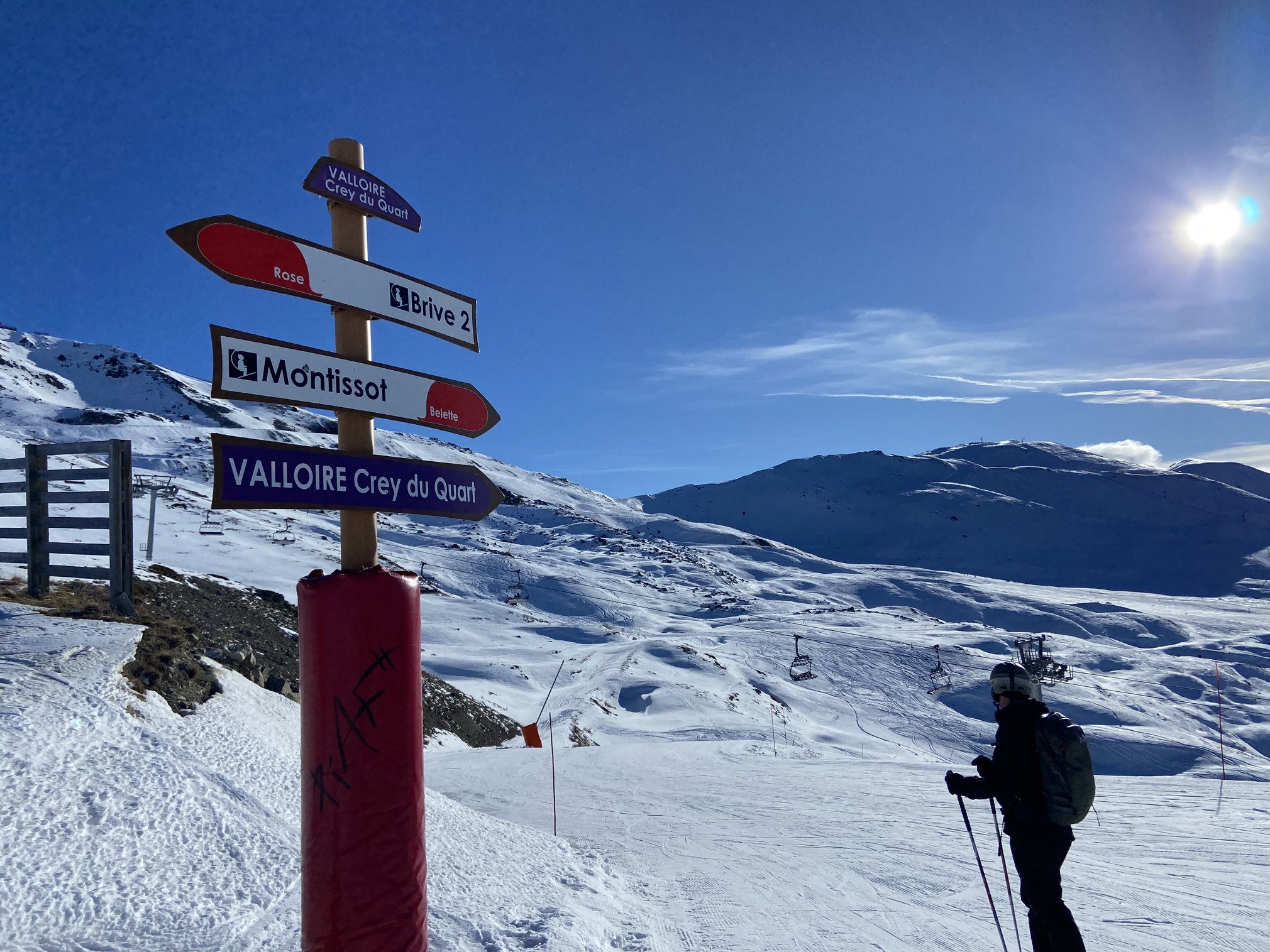 Après la pause déjeuner dans la salle hors sac, au chaud et sans trop de monde, on tente les pistes direction Valmeinier en prenant la piste de la Combe. Fausse bonne idée, il y avait trop peu de neige, on voyait la terre apparente à certains endroits et surtout des cailloux que j’ai bien senti sous mes skis 🥴