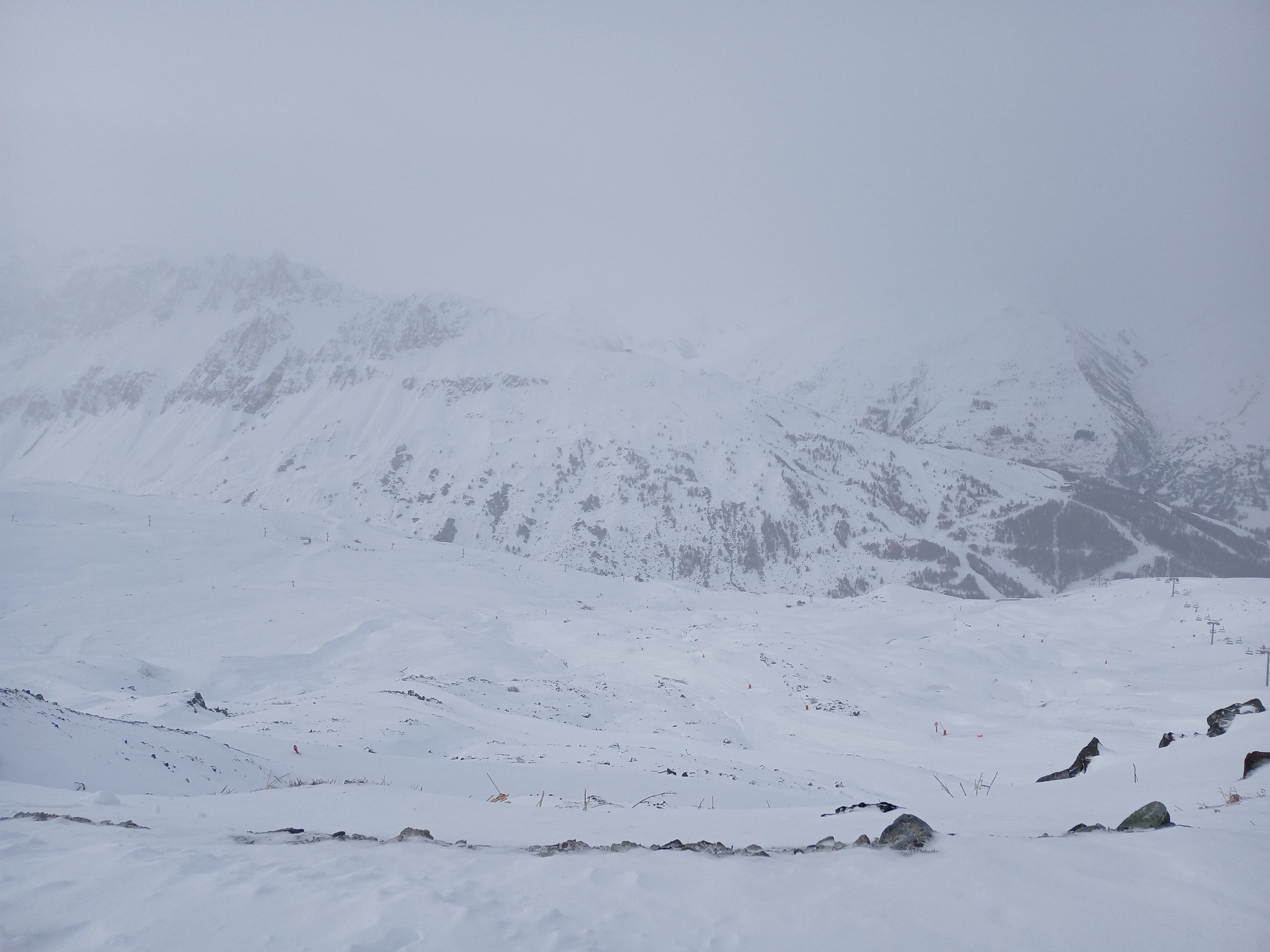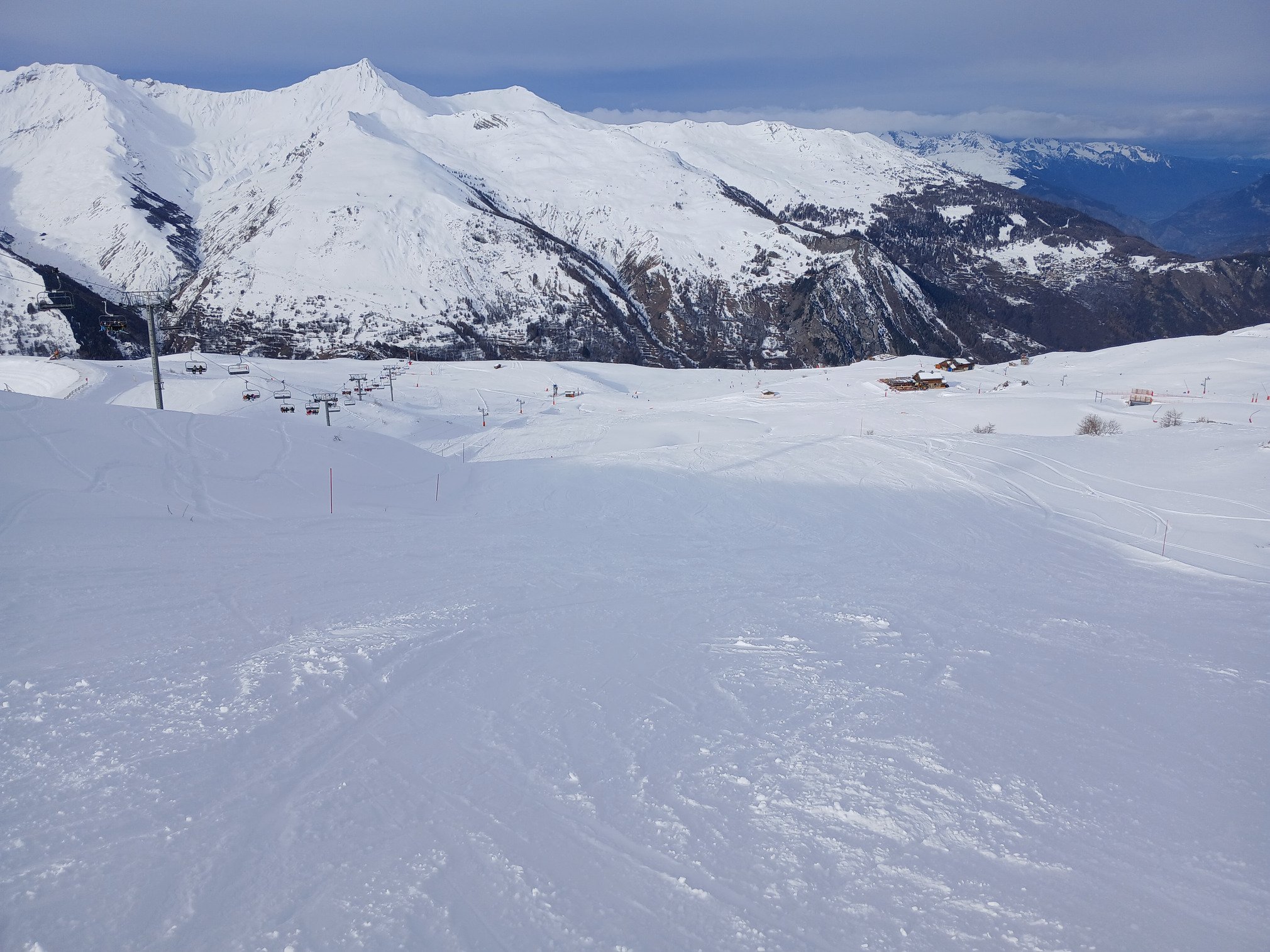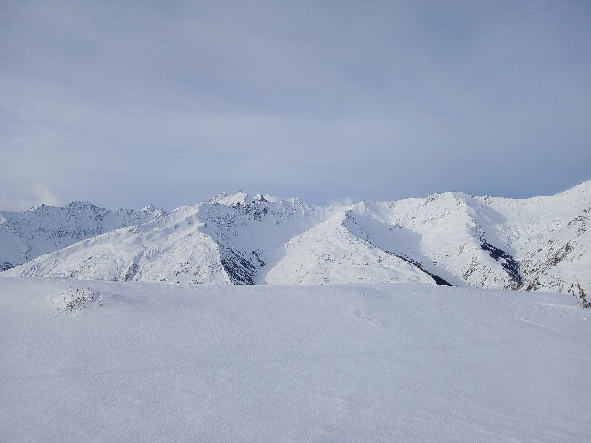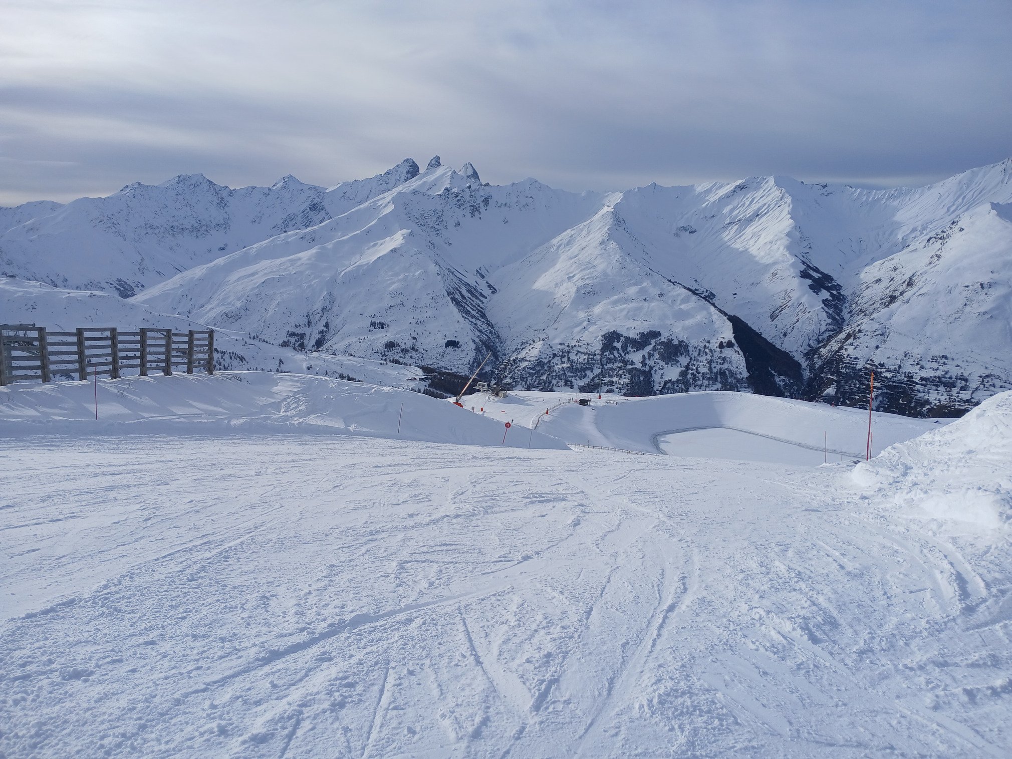 Les conditions sur piste étaient pas loin d’être parfaites, mais la pluie qui commençait a tomber lorsque nous sommes repartis cette apres midi me laisse penser que ce ne sera plus le cas demain. Neige plus lourde en bord de piste, et des cumuls bien plus modérés que ce qui semble être tombé sur d’autres vallées.