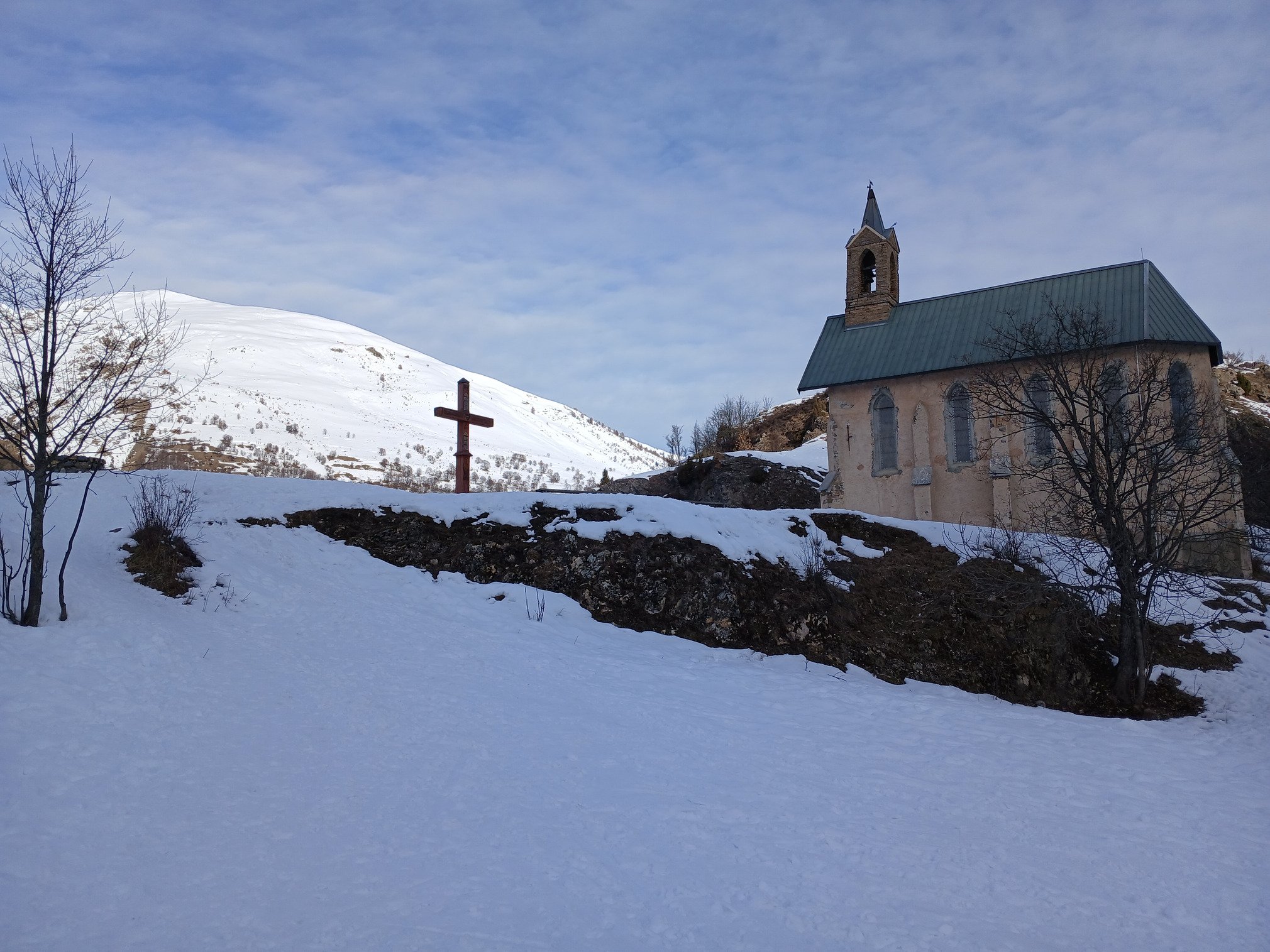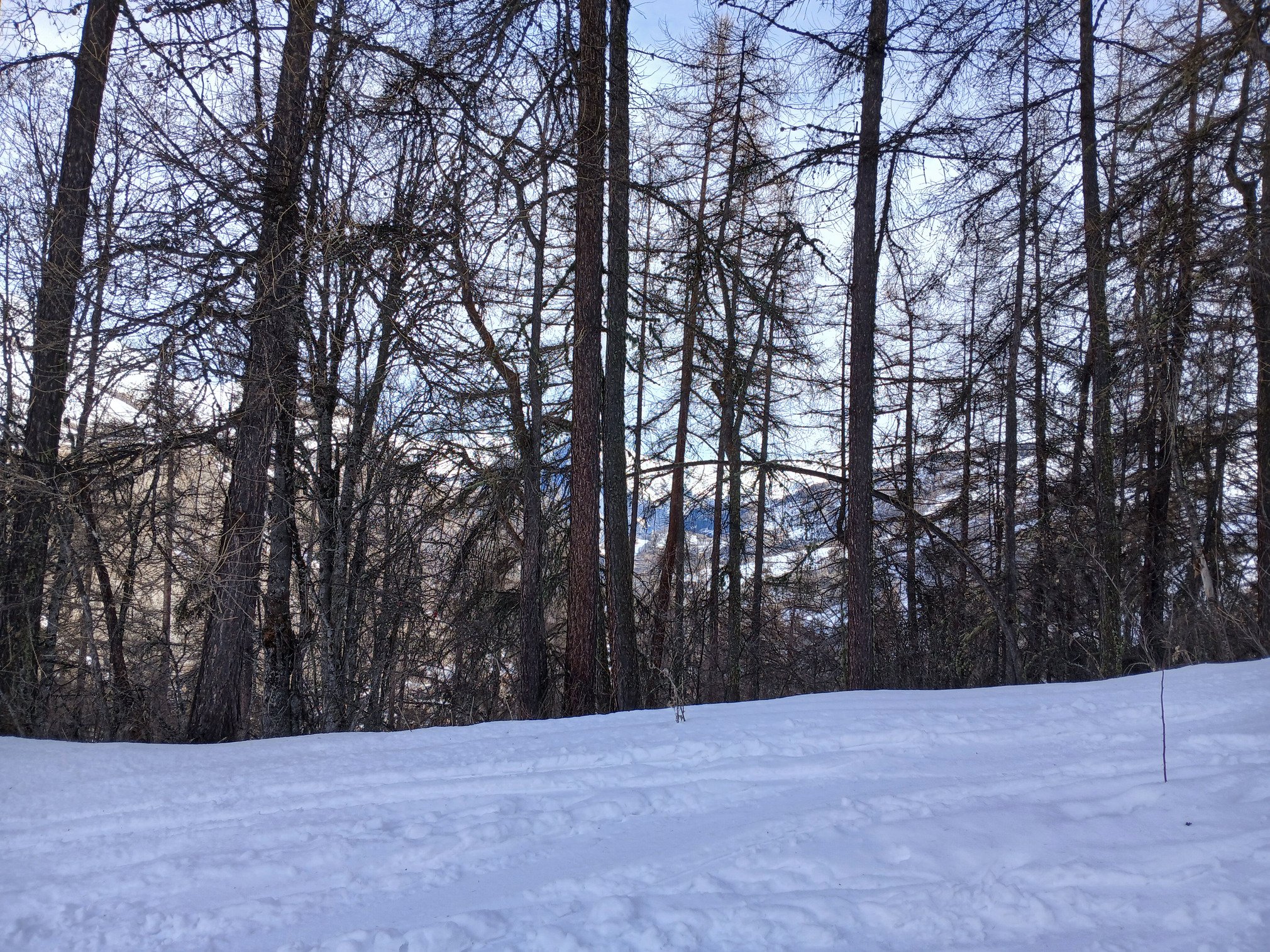 Pendant que les enfants sont à l’esf, nous remontons par les rhodos, enneigés de bas en haut, ce qui n’est pas si fréquent, redescente par les melezes. La neige sur piste reste très agréable, un peu croutee hors des pistes en dessous de 2000.