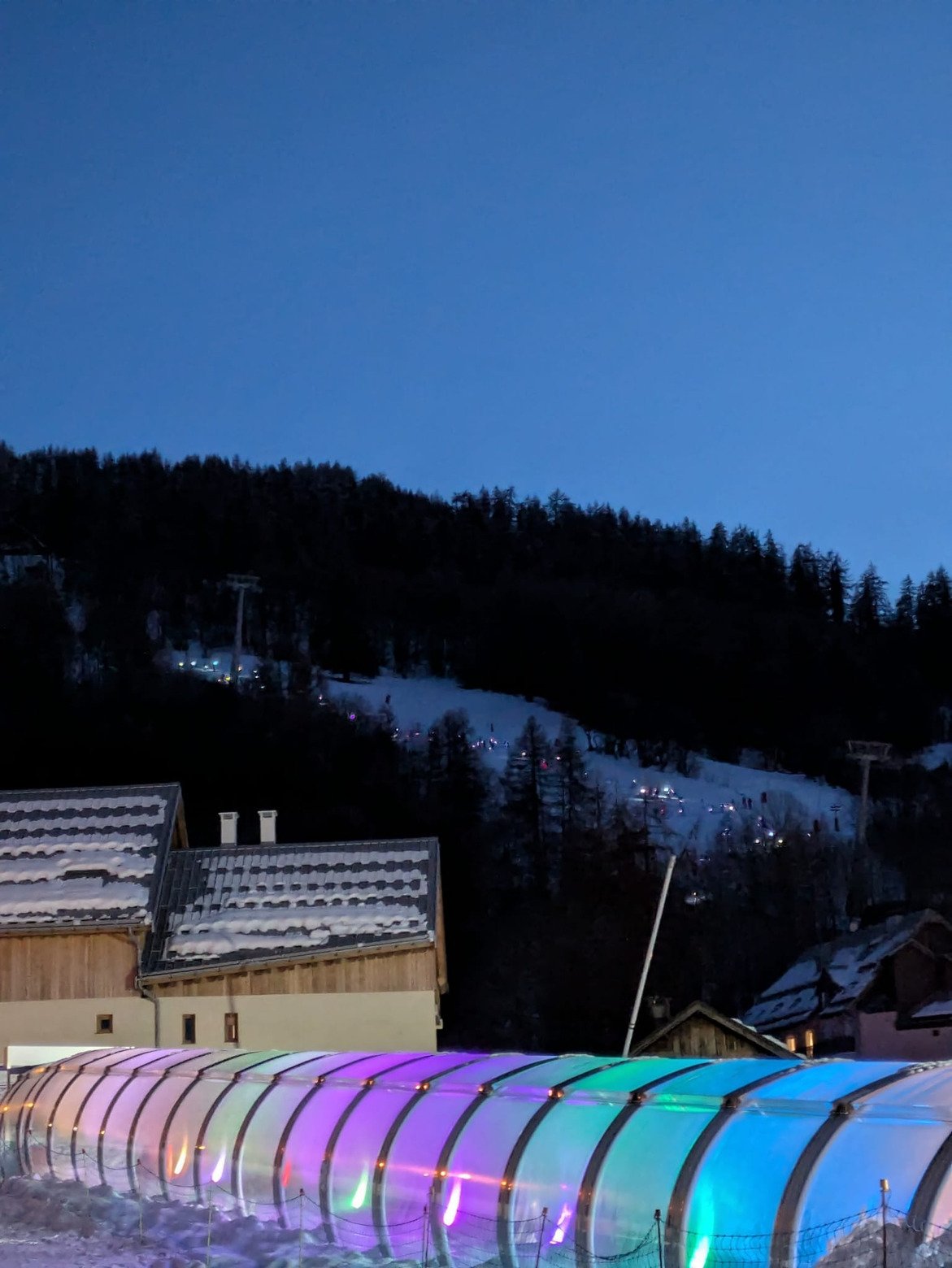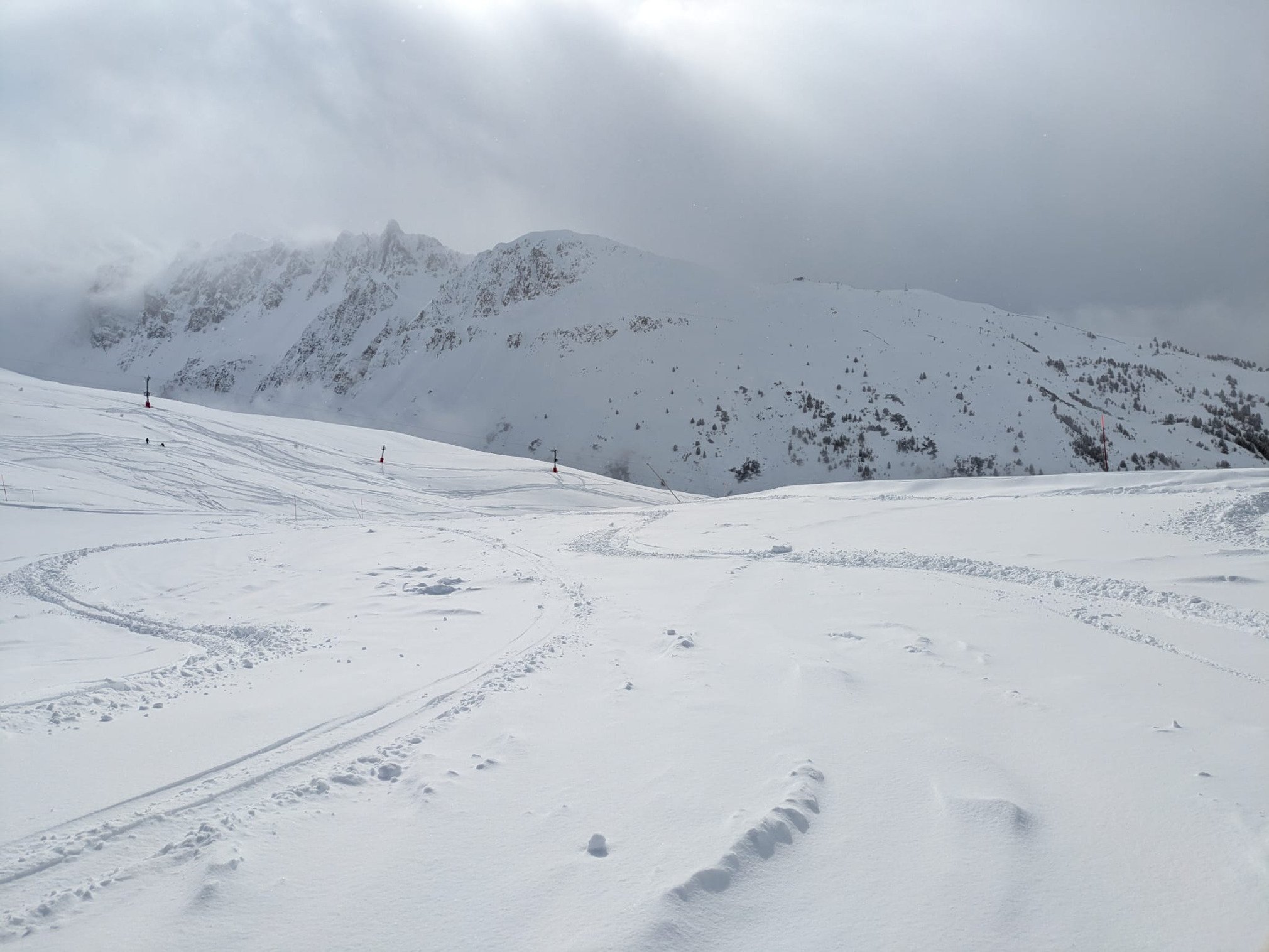 Personne sur les pistes, et de la fraîche jusqu’aux genoux, parfois même entre les jalons. Ma fille découvre le plaisir de la première trace sur une piste ouverte, en plein milieu d’après midi. Mon piou piou est déstabilisé de voir ses skis disparaître sous les accumulations de bord de piste, avant de trouver ca tout de meme bien rigolo. Je le redescends par les lutins, avec le harnais dans la poche par précaution. Ca passe crème, je ne le sortirai pas une seule fois sur la descente.