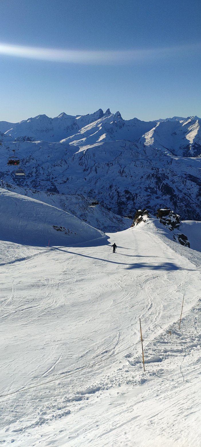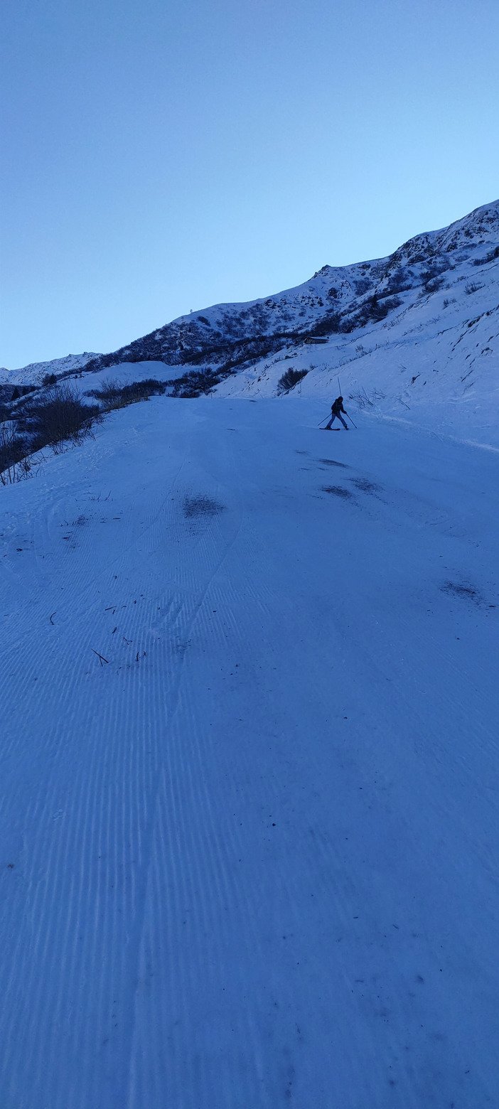 Afin de retourner sur Sandonière (à Valmeinier, où la neige était aussi bonne et douce qu'hier sur piste, et avec encore de quoi tracer hors piste, dans 10-15 de poudre légère dans les bonnes orientations, mais vite croûtée ailleurs), on a décidé de prendre la piste bleue Combe Orsiere (depuis le sommet du TK Grand Plateau). Elle est fermée, officiellement pour manque de neige. Ce n'était pas trop un souci de ce point de vue là (j'ai même pu faire 6-7 virages poudreux exquis entre deux lacets de la piste sur le haut). Davantage que d'absence de neige, le problème résidait dans l'excédent de carrelage sur la partie basse 🥴. Suivant votre niveau, ça passera sans soucis ou beaucoup plus difficilement. Je déconseille fortement aux skieurs débutants ou intermédiaires.