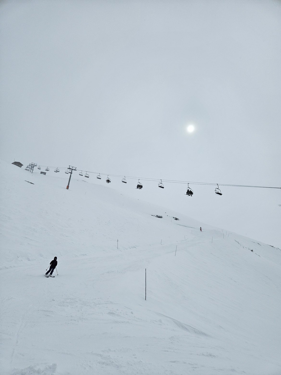 ⛷️ La pub dit aussi : "protège des conditions, pas des décisions à la con". La décision à la con, ça aurait été d'aller en hors-pistes. Non non non. 5cm, ça ne suffit pas à se protéger des sharks. Autre décision à la con : monter à la pointe de la Sandonière qui est nappée dans le coton. Cette fois, c'est mon ange gardien du jour qui me dissuade. Ouf.