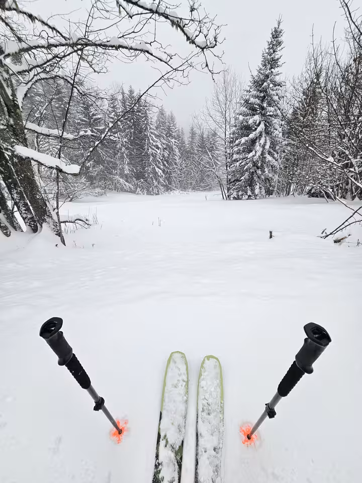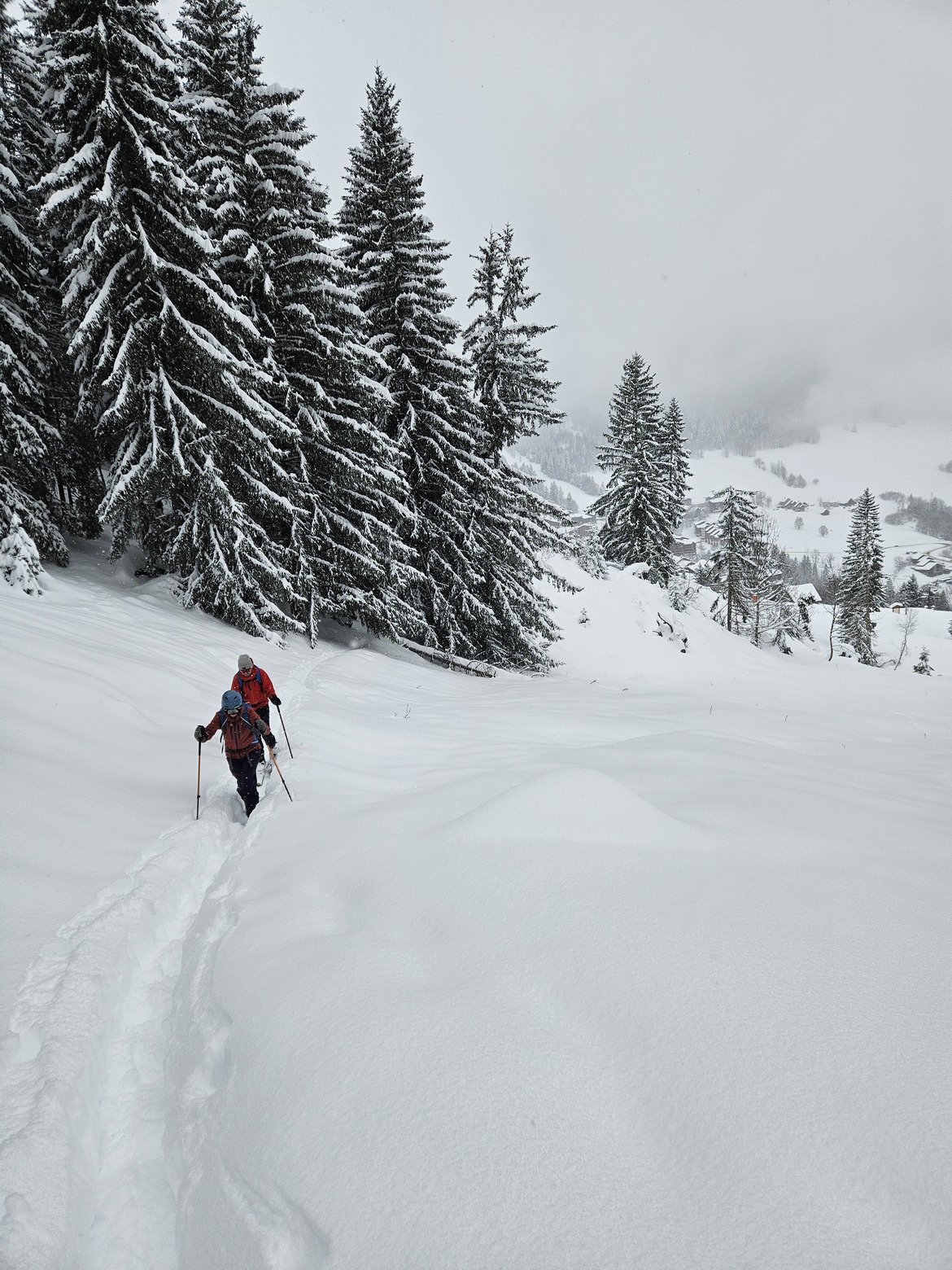 Changement d’équipière, changement de matériel. Trois heures de ski sur le domaine, toujours sous les averses de neige, mais cette fois sans PIDA.