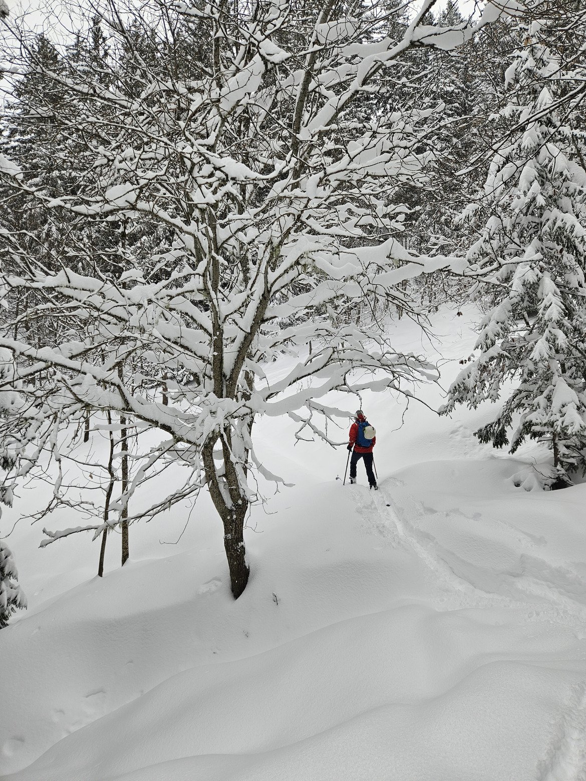 La montée est douce (200 D+), l’ambiance en forêt absolument magique. J’en profite d’autant plus que c’est le copain qui fait la trace, parce que « lui, il aime bien ça ». Bon… il a quand même bien labouré.