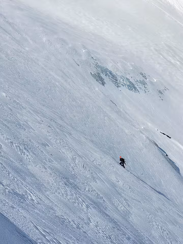 Fini l'aventure, fini les galères que nous aimons tant, le terrain est facile et inintéressant. Juste une pente basique à remonter jusqu'au sommet. C'est tout de même dommage toute cette neige fraîche alors qu'on pourrait avoir des conditions de printemps.