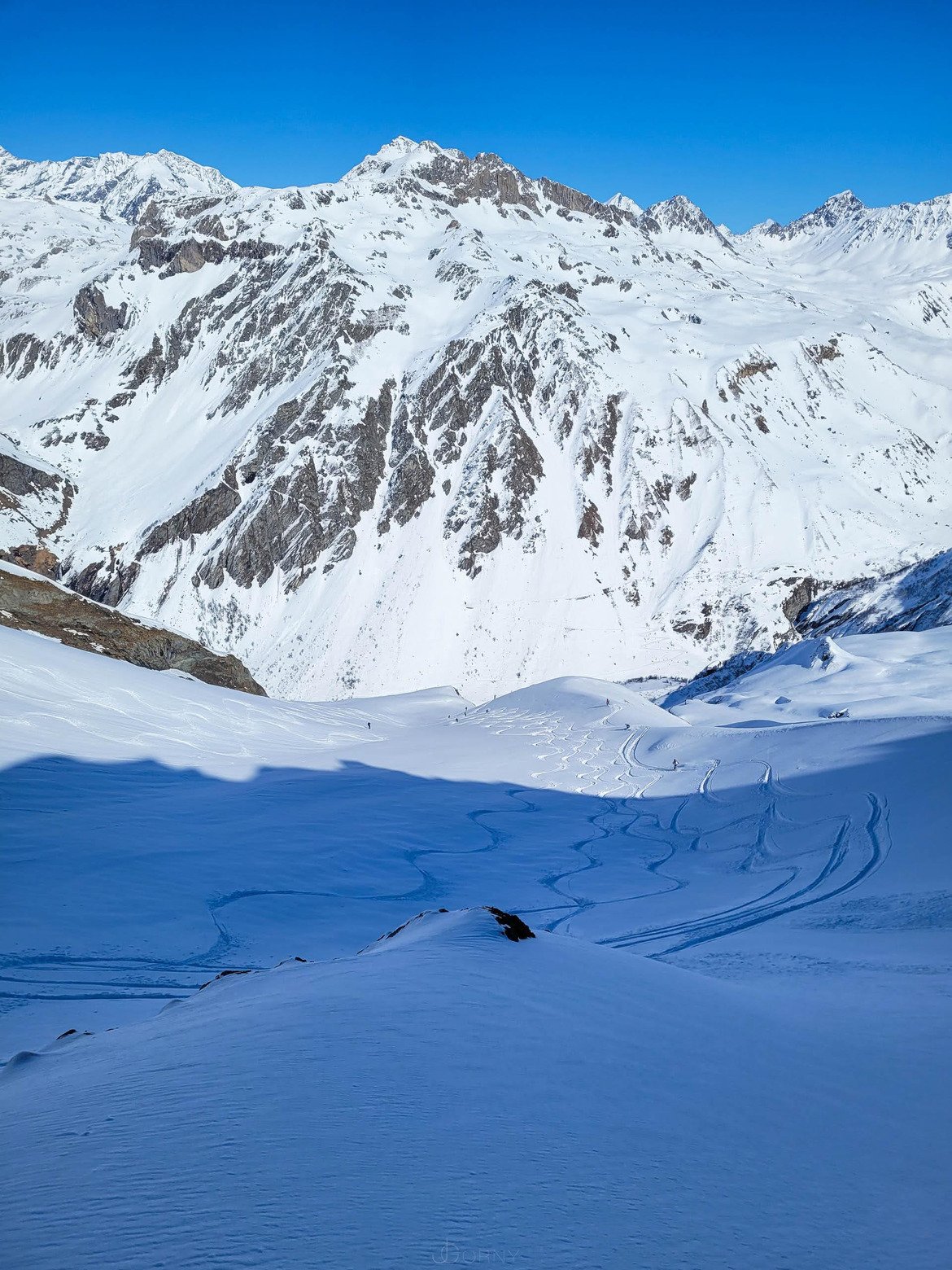 La déconvenue arrive plus tôt que prévu. Nous étions venus chercher le défi, le challenge... Niet, le temps se découvre et nous montre à nouveau cet insoutenable paysage blanc et bleu immaculé. Aïe aïe aïe. C'est avec des relants de début de saison (voir mes premiers live de cette saison) que nous faisons pas vers le sommet, en traînant les pied dans cet enfer blanc.