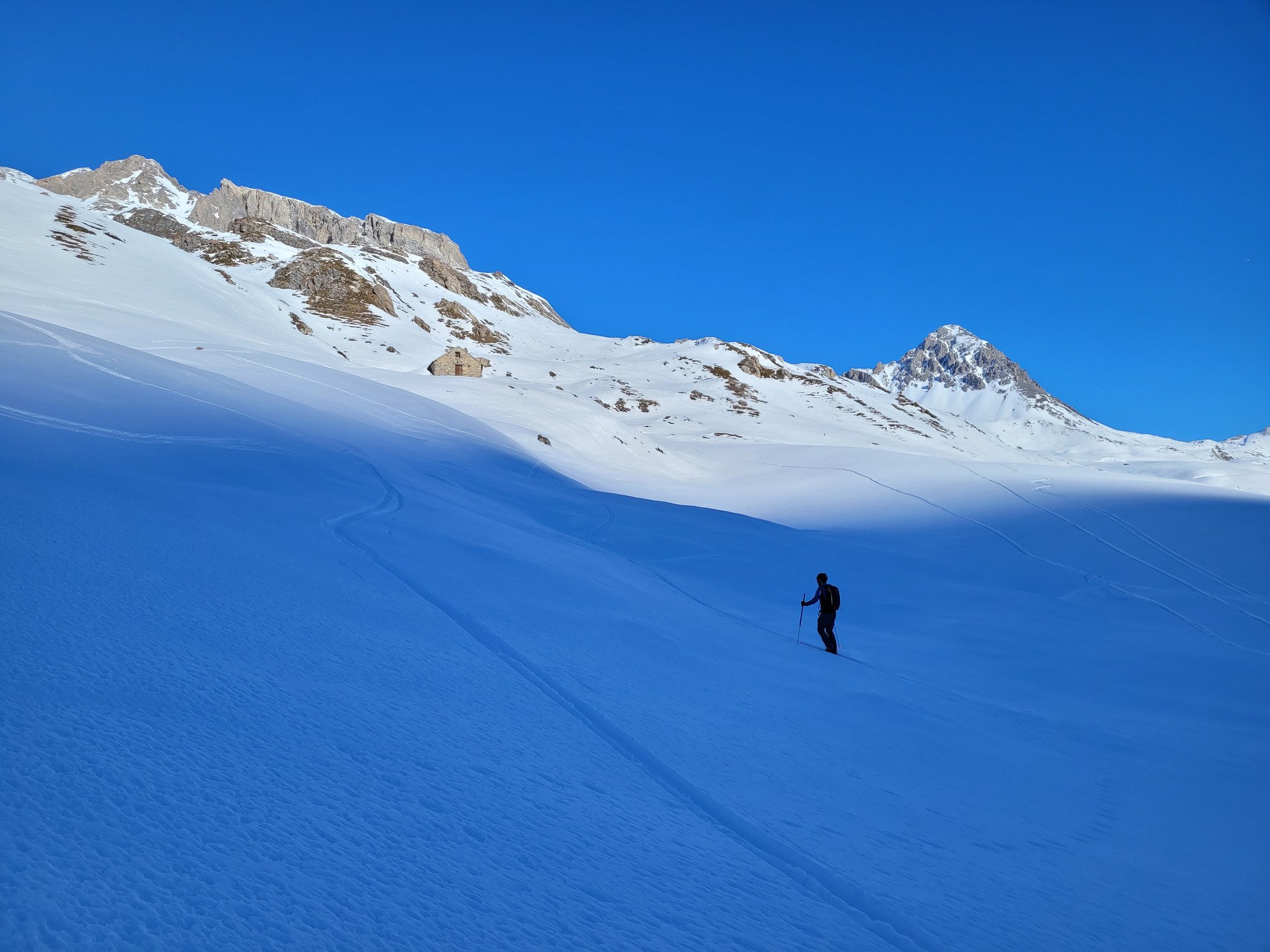 14km de montée pour 1600m de dénivelé. En plus d'être interminable d'avoir gelé à l'ombre (jusqu'au chalet des écuries, limite ombre-soleil à 2300m) puis cramé au soleil, on s'épuise à passer de neige gelée à croûtée et à de la veille poudre.