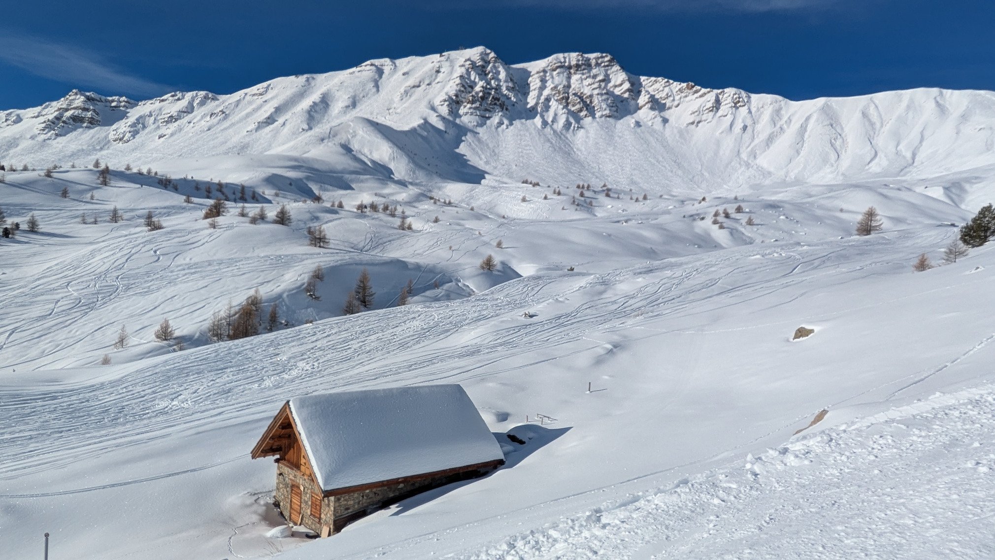 Pas mal de monde avait visé le créneau météo, c'est plus chargé que la veille. Mais ça empêche pas de toujours trouver des poches de neige fraîche et des lignes à rayer, a côté du KL, côté Clos Chardon, même sous les mélèzes côté Risoul !