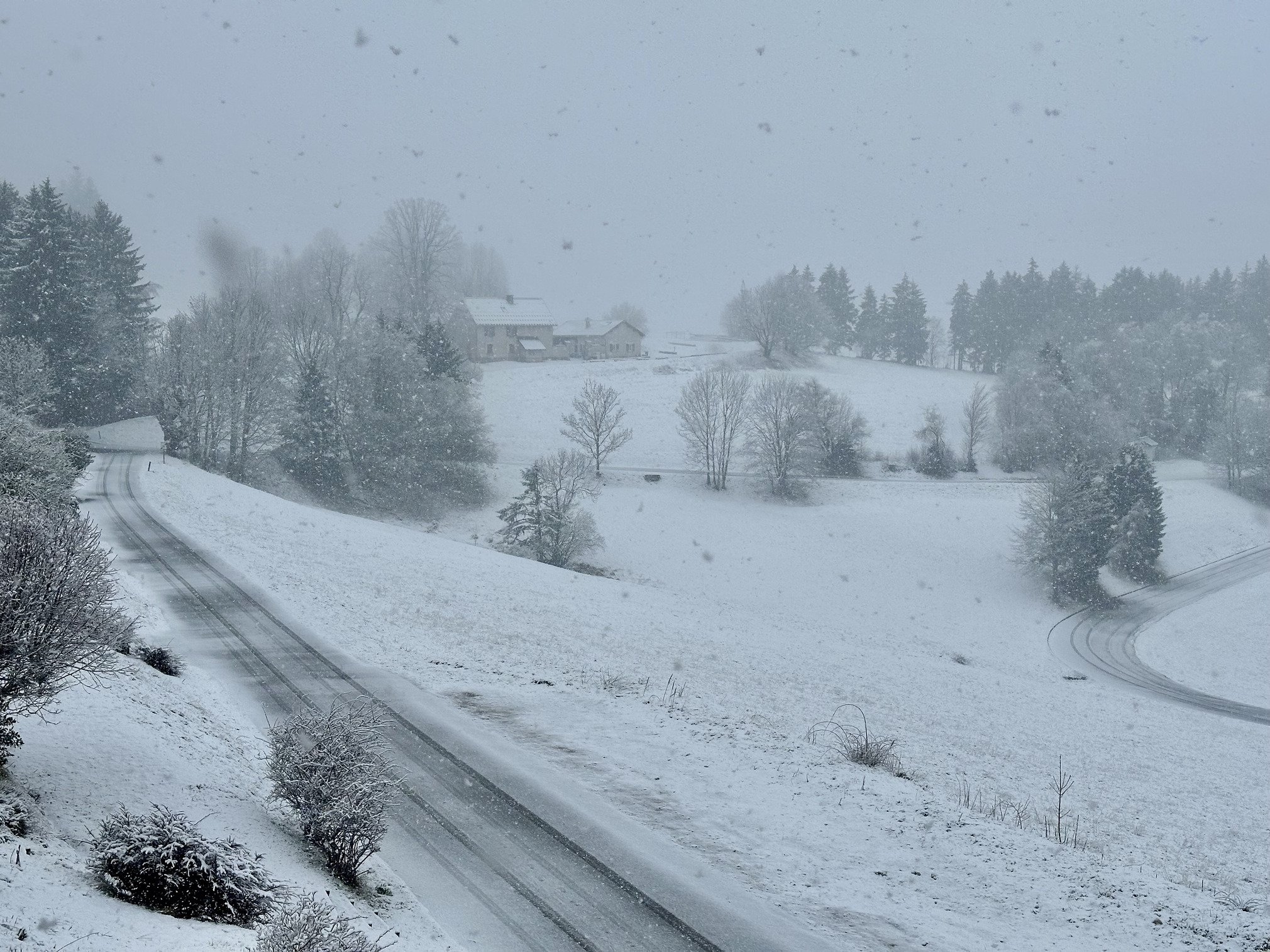 Résultat à 10h : ambiance déjà 100% blanche à 1200m ( Saint Nizier du Moucherotte) où l’on était au vert, avec à vue de nez déjà 3, 4 cm de neige forcément humide avec la température toujours positive.