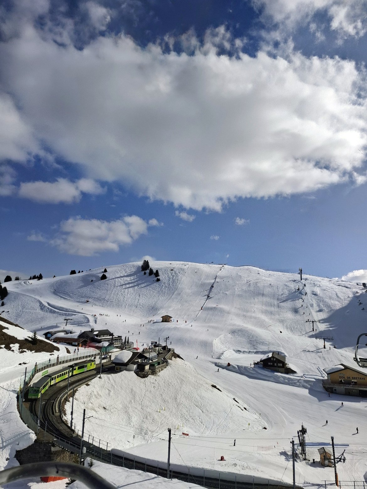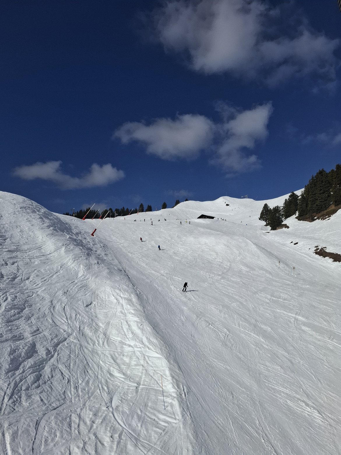 Bon, la neige est déjà en mode printemps dès les premières descentes, mais ça reste assez fun. Je commence par faire 3-4 pistes avec un peu de carving sous le Grand et le Petit Chamossaire, histoire de me chauffer.