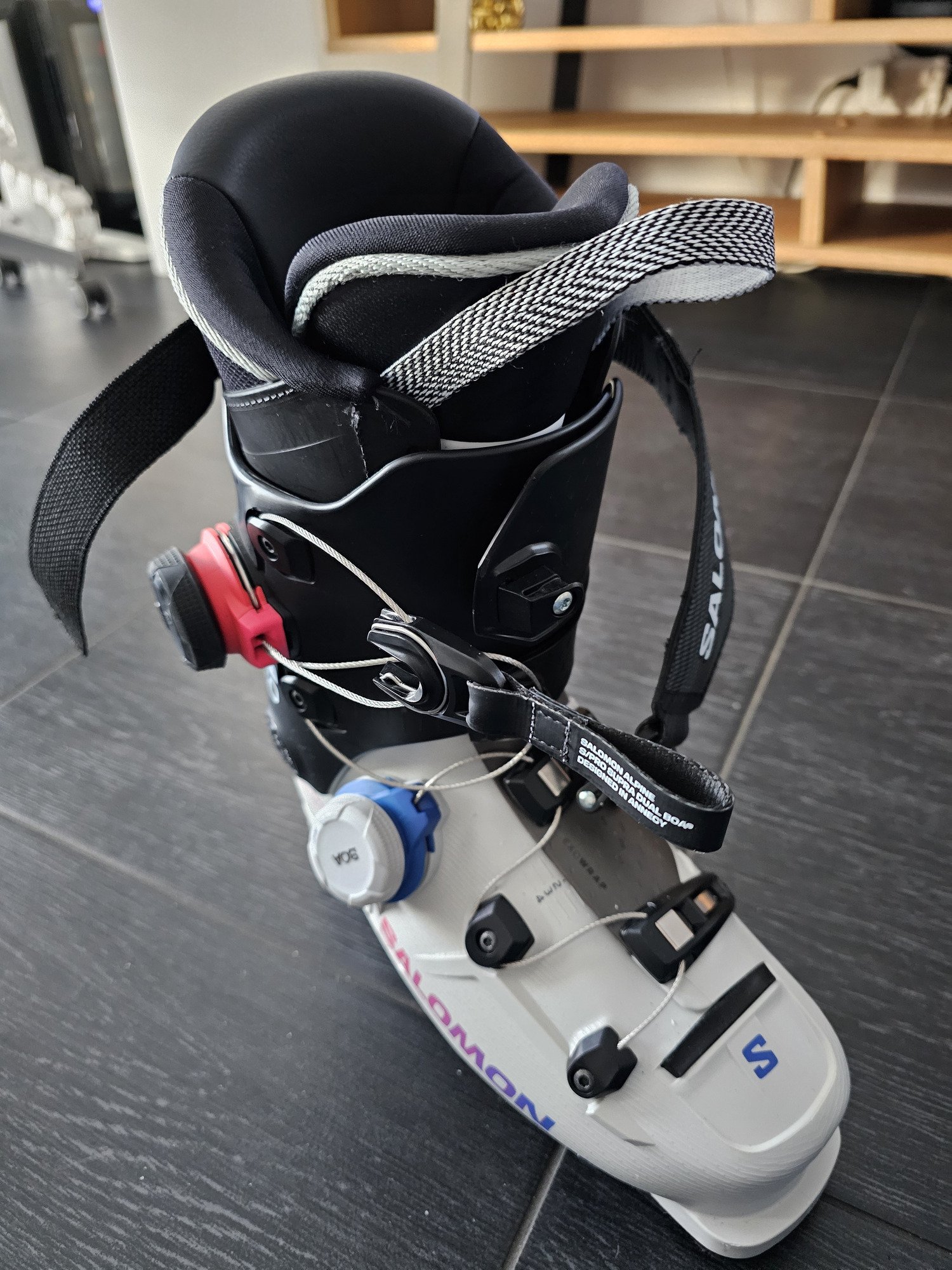 NB : la languette ayant un système de réglage par scratch sur l’avant du chausson (pour l’avancer/reculer), si vous tirez trop de dessus, elle finit par se détacher et vous êtes bon pour sortir/remettre le chausson dans la coque, pas idéal à l’arrière de la bagnole sur le parking du télécabine…