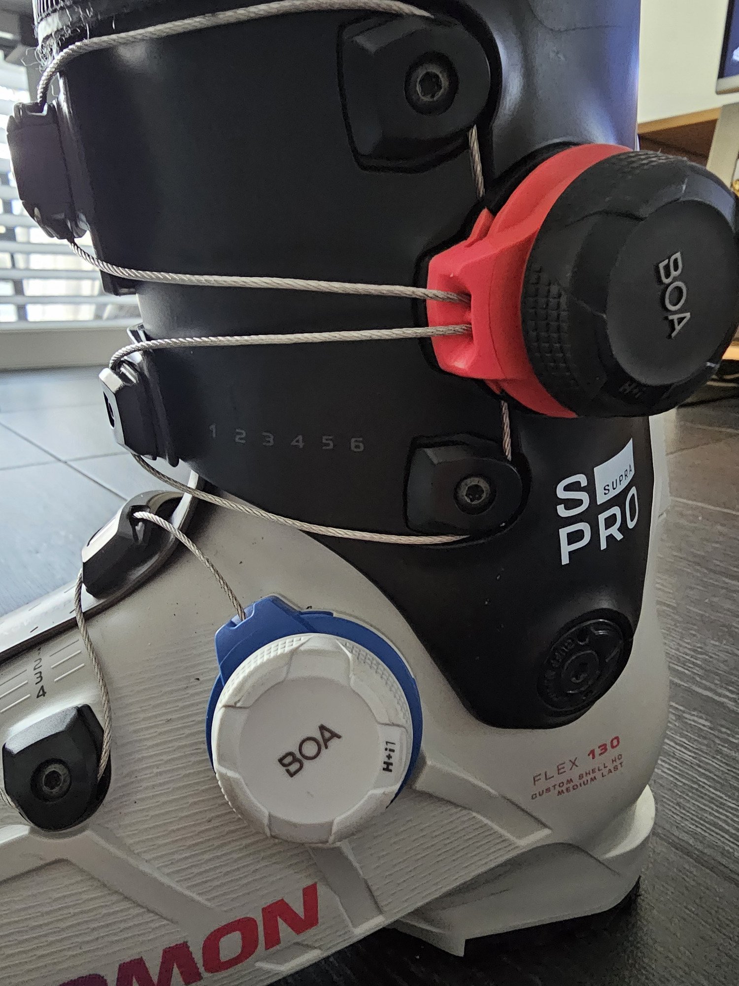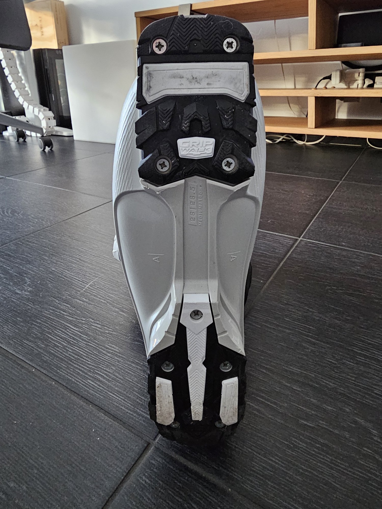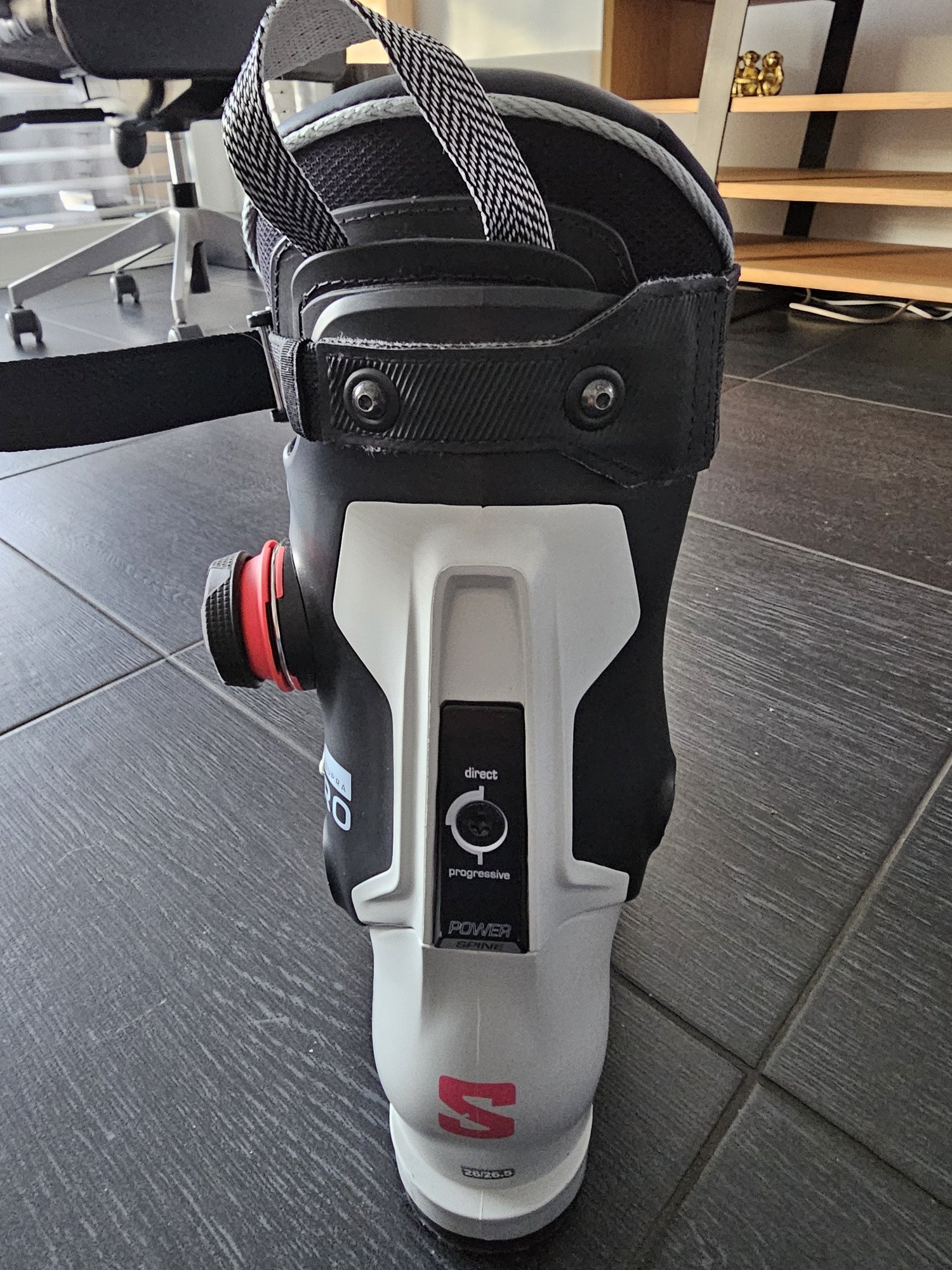 Avant de recevoir les pantoufles de Cendrillon, passage rapide en magasin (j’achète toujours mes chaussures en boutique, car l’essayage est primordial ainsi que le bootfiting) pour valider la taille avec une coque en 26/26.5 pour ma part (j’arrive à la limite du chausson en longueur, donc chaussettes fines obligatoires) mais les modèles Supra étant en largeur moyenne avec 100mm au métatarse, pour garder en précision, la coque 27/27.5 était trop large.