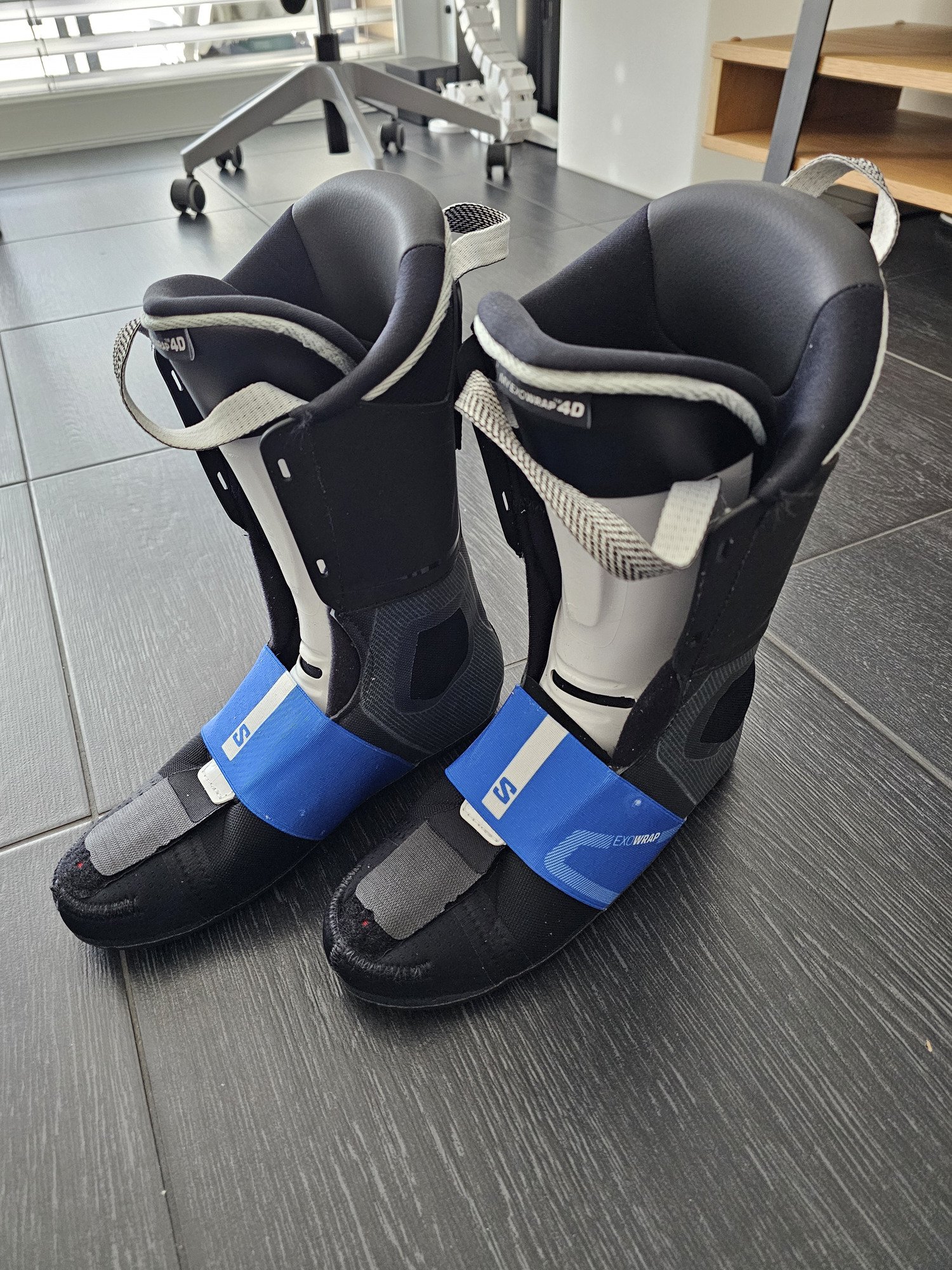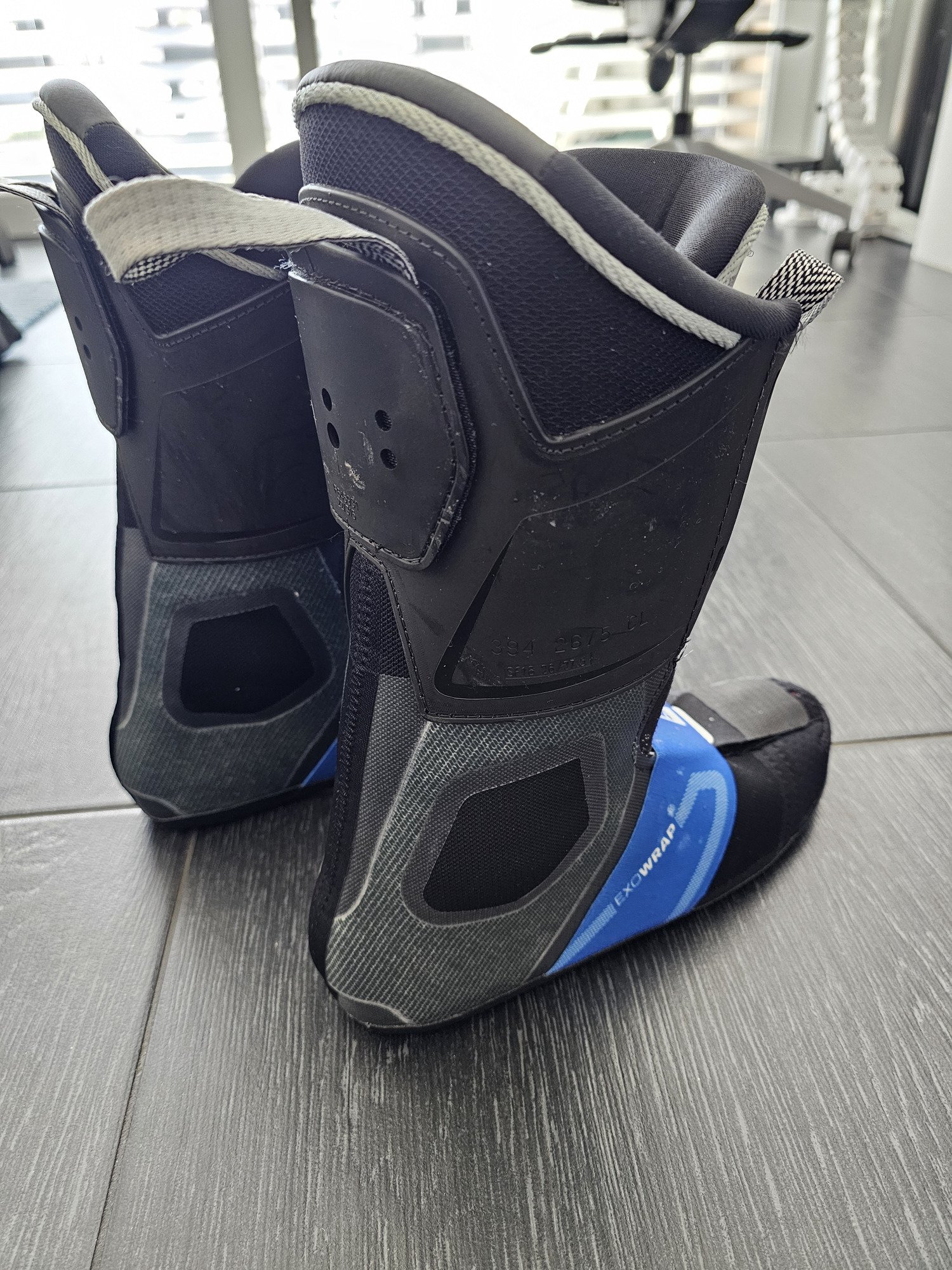 • Chausson Exowrap avec une bande élastique sur le coup de pieds, sensé améliorer le maintien mais qui, si la chaussure est choisie à la bonne taille, ne m’a pas parue révolutionnaire avant ou après le thermoformage. Il reste confortable et précis pour cette gamme de chaussure. La languette est démontable et customisable (+/- 8mm de mousse), avec un spoiler arrière de 6 mm, que j’ai gardé car la chaussure n’est pas particulièrement inclinée.