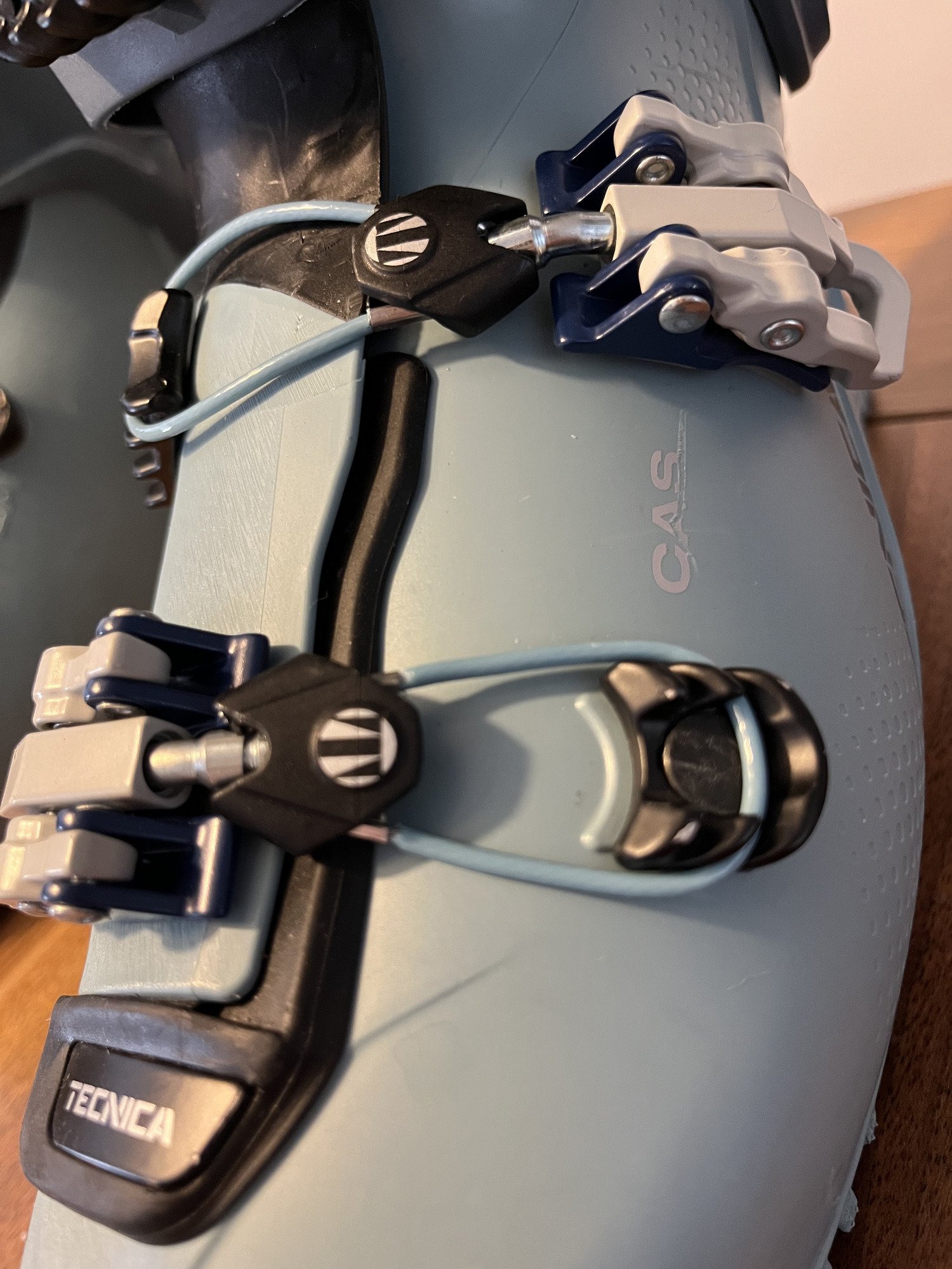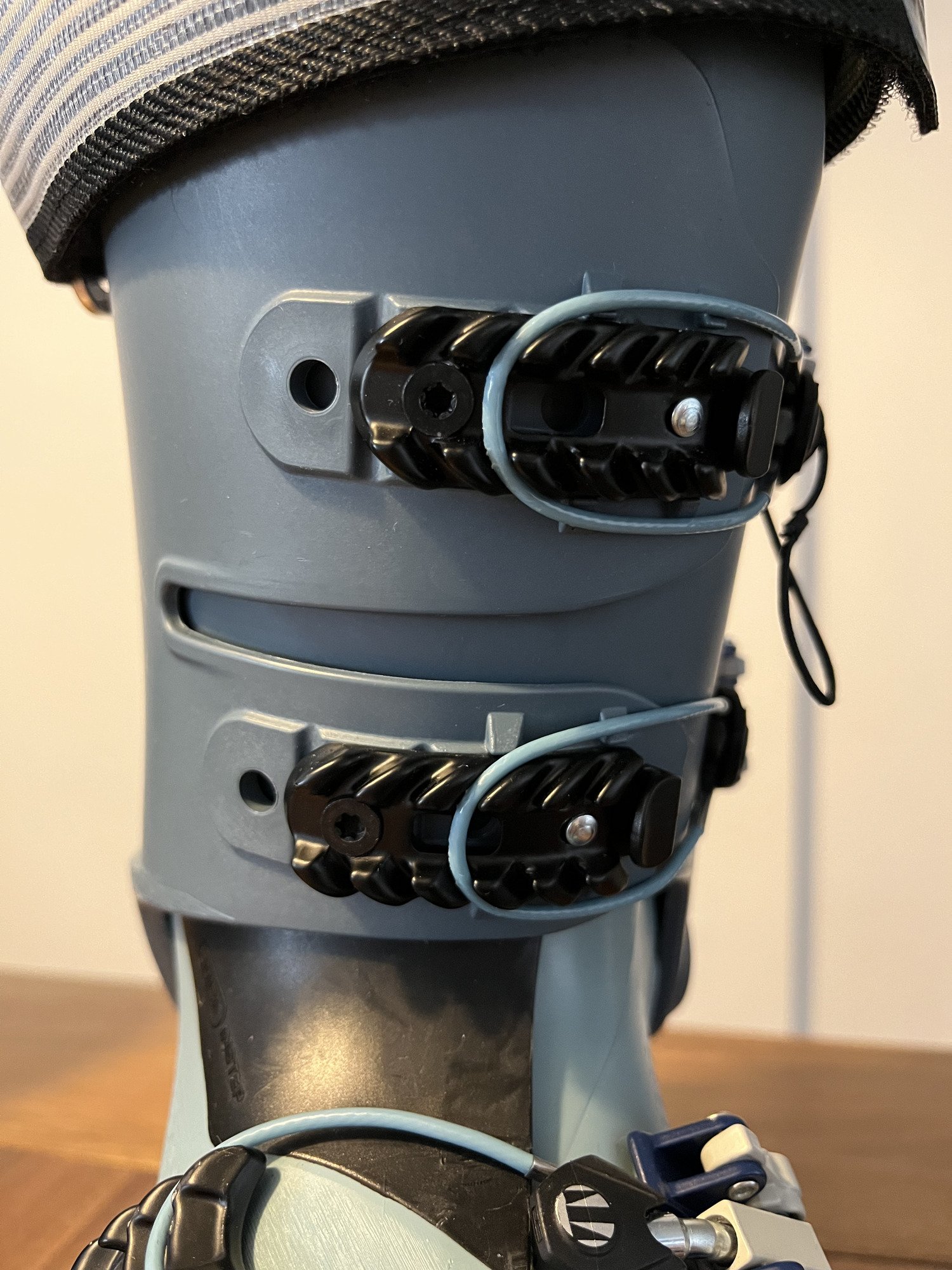 Encore adepte du crochet, je ne suis pas prête pour le boa. En montée, le serrage des deux boucles du haut se font sur le premier crochet, un peu plus profond, permettant à la boucle de bien rester en place lors du débattement. Le serrage du pied a un large choix du fait que les deux boucles sont inversées et modulable si l'on veut serrer plus ou moins fort. Pour ma part j'ai positionné les boucles sur les 2ème crochet. Mon pied ne bouge pas, pas de frottement et je ne suis pas serrées. Sachant que mon pied est large et fin.