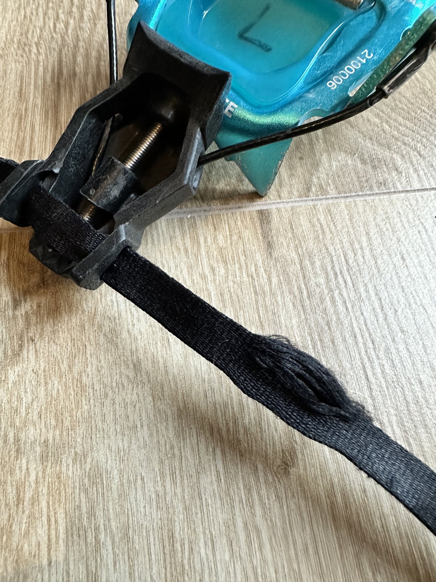 Les sangles autour du pied sont fines. Un coup de crampon peut facilement endommager ++ la sangle. C’est du matos light donc c’est logique que ce soit plus fragile que d’autres crampons 2 à 3x plus lourds.