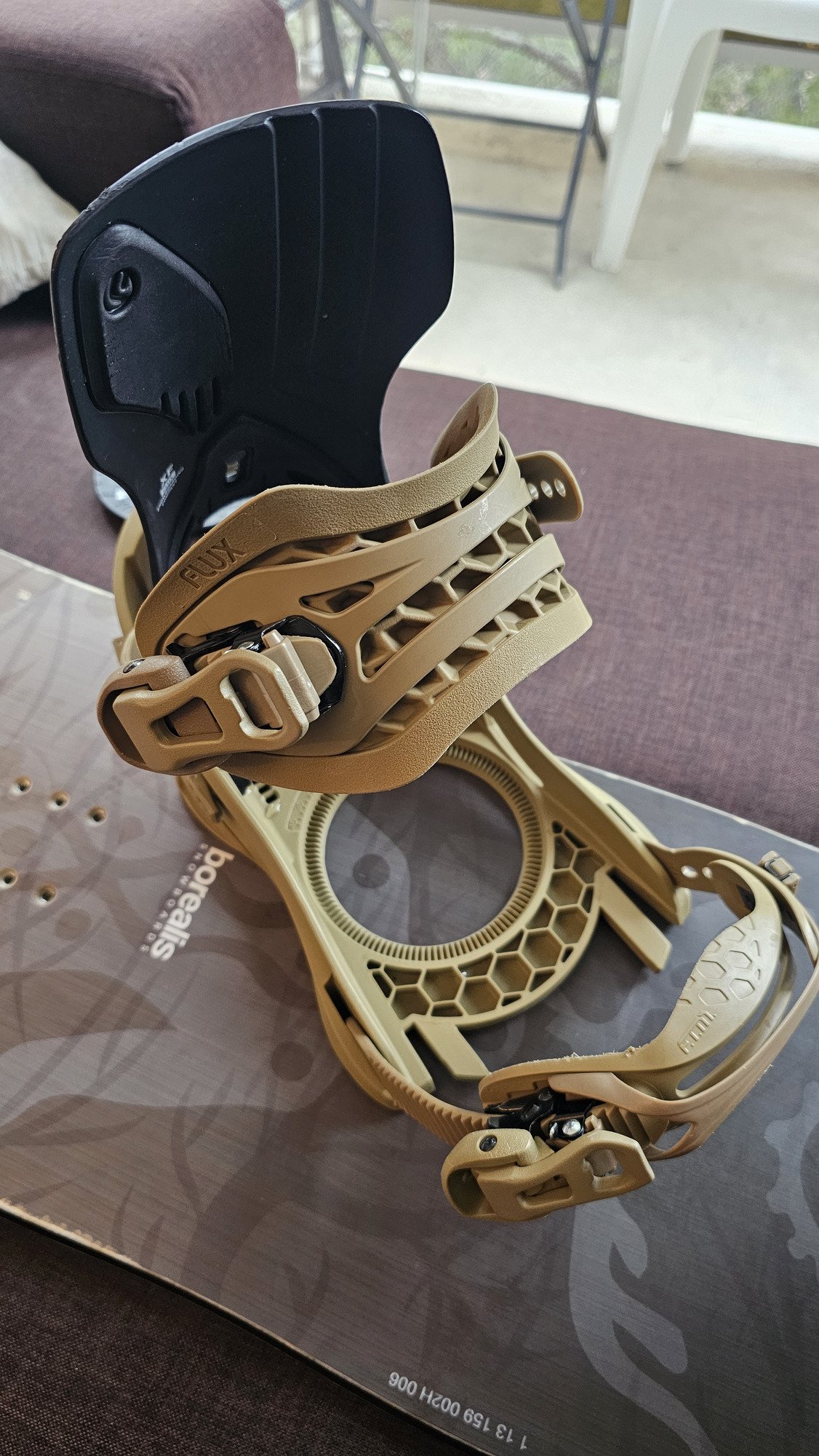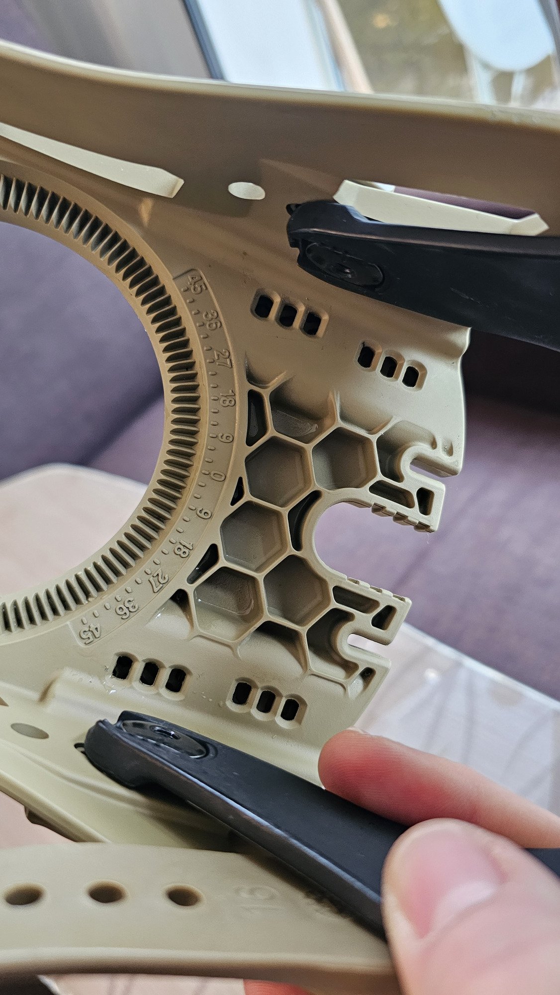 Quand on la porte à la main démontée et que les caches sont enlevé, on comprends mieux pourquoi ça transmet fort : une construction optimisé mais lourde, en composite très dense. Les straps ne sont pas très facile à enfiler, mais aucuns souci à signaler. Je préfère ça que l'inverse. C'est du chipottage. Les pads au niveau des pieds empêchent l'accroche de la neige et donc la formation de glace : avec une simple passe de la main j'enlève toute la neige à ce niveau.