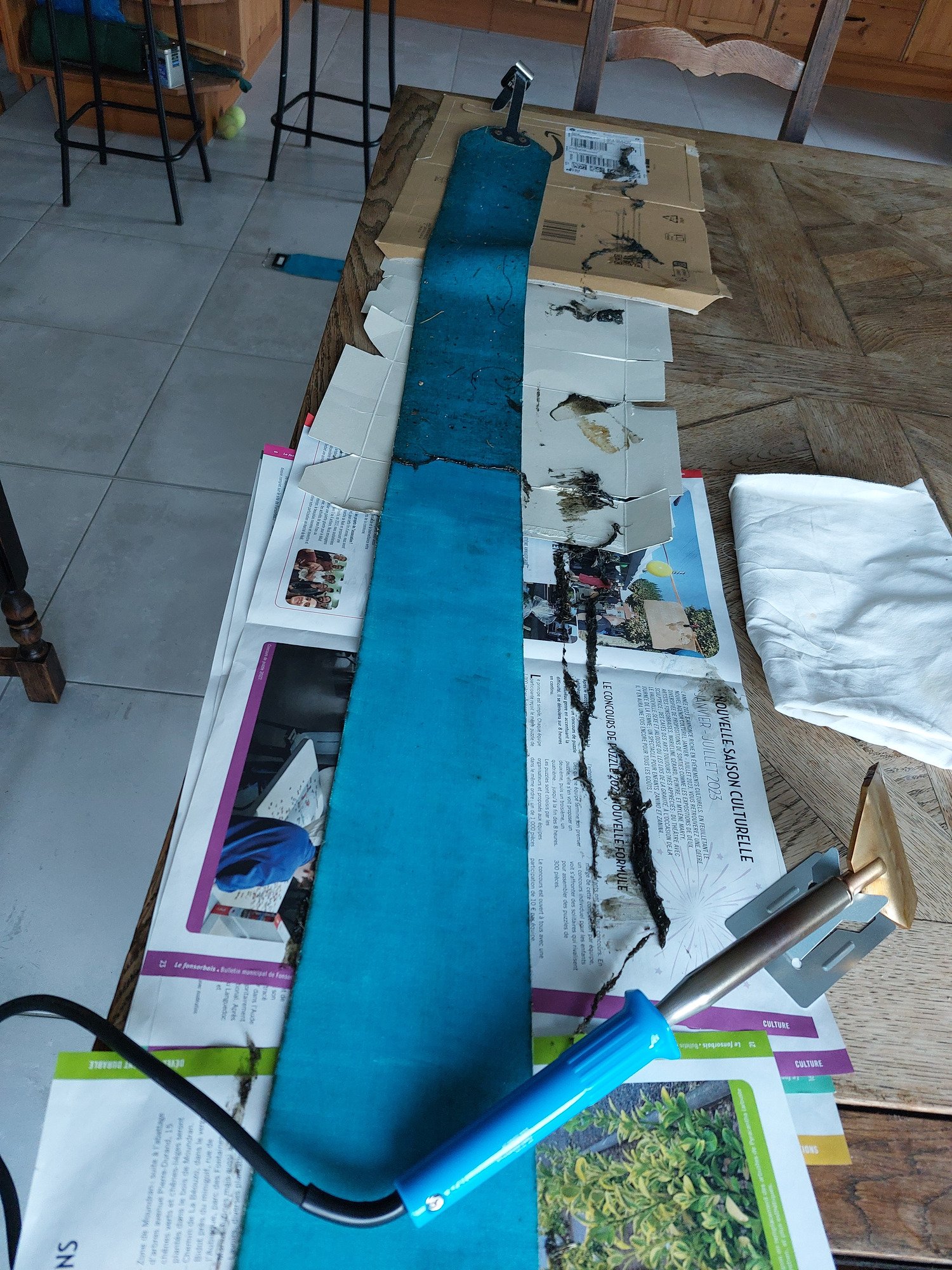 L’outil indispensable donc pour effectuer un ré-encollage, c’est un racloir chauffant, sorte de fer à souder, mais avec une panne très large (j’ai mesuré exactement 7,5 cm) et bien plate. Alors je ne vais pas vous faire un tuto de comment utiliser ce racloir, il est très facile de trouver ça sur YouTube, mais ce que je peux dire, c’est que c’est très simple et incroyablement efficace. Le racloir permet dans un 1er temps d’enlever ce qu’il reste de l’ancienne colle, tout simplement en raclant, et on peut constater sur les photos qu’on voit clairement la différence entre avant et après (d’ailleurs je n’avais pas réalisé à quel point mes peaux étaient crades !!!).