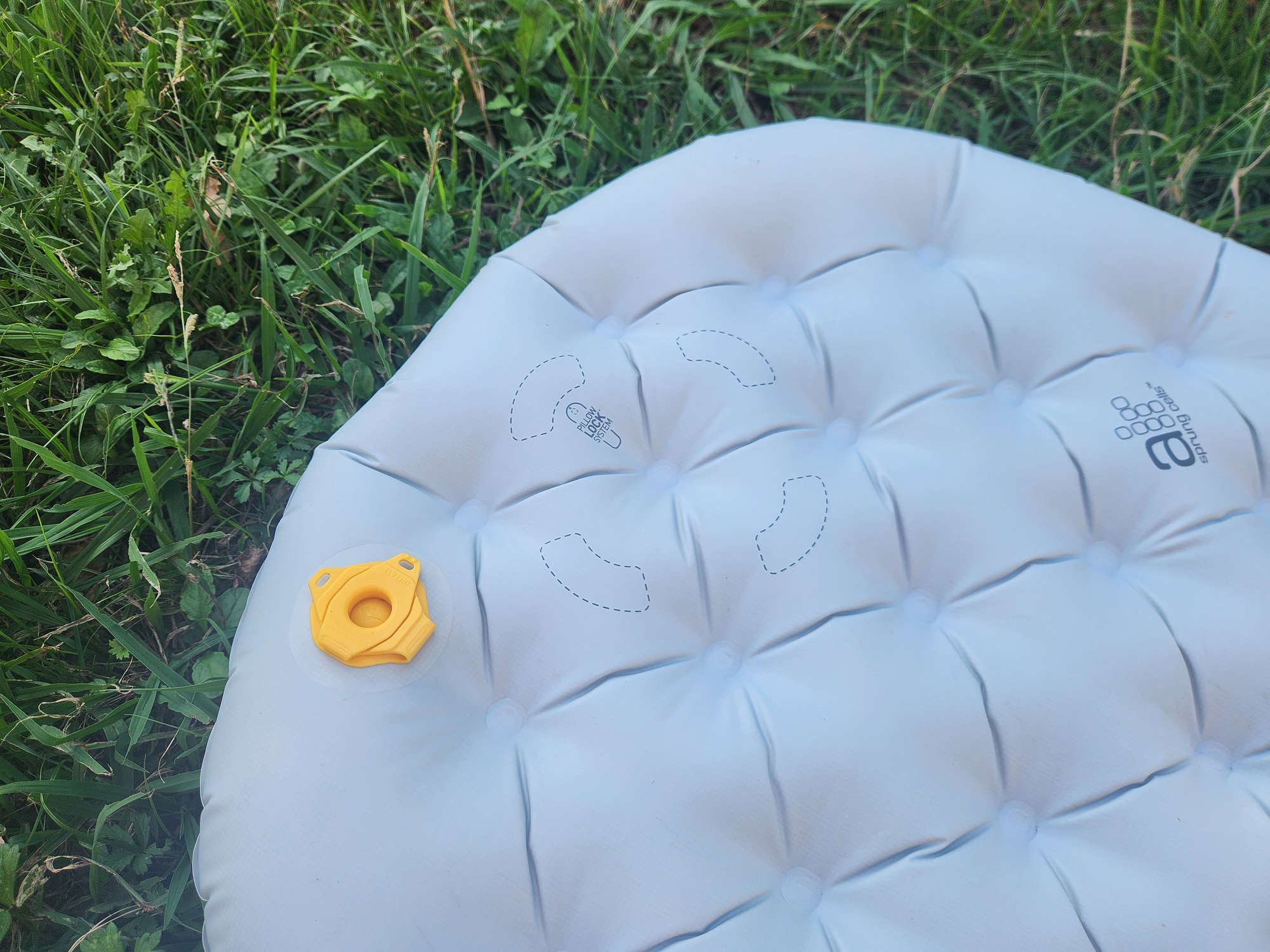 On déroule et aplani le matelas avant de connecter le sac de gonflage ne faisant qu’un avec la housse de rangement. Au premier gonflage, on se dit que cela ne va pas être rapide et puis après une dizaine de compressions du sac, on obtient notre lit de fortune avec de grosses alvéoles. Une fois le matelas gonflé, l’épaisseur atteint 10 cm en 5 mn de temps.