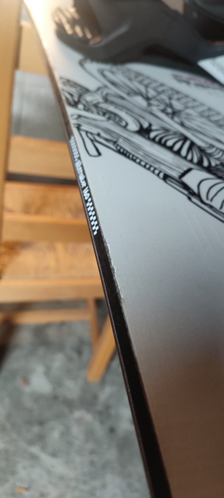 S’il n’y avait eu que ça.. soit. Mais sur les autres sorties, les bords de la board ont montré des écorchures, pelades du top-sheet (comme si elle s’était faite passer dessus dans la queue aux télésièges, sauf que les jours où c’est arrivé, il n’y avait personne aux entrées des sièges). A part ces petites parties (en haut à droite sur le nose, entre mes talons et un peu en dessous côté talon arrière) rien de plus.
