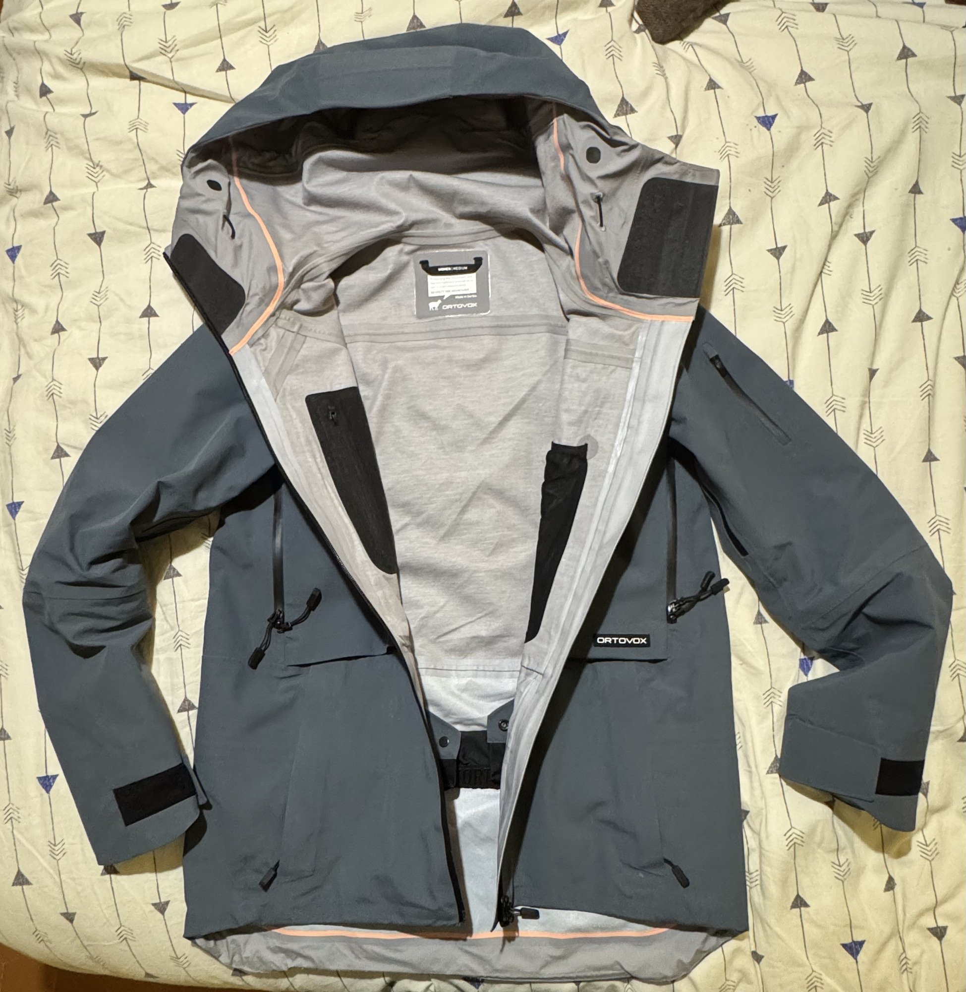 Dès les premières sorties, cette tenue m’a séduite par sa coupe freeride à la fois confortable et suffisamment ample pour permettre de superposer les couches selon les conditions pour la frileuse que je suis ! De plus, petit coup de cœur pour sa couleur dark arctic grey, sobre et élégante, associée à une coupe et un style épuré. On retrouve la signature d’Ortovox avec ses lignes asymétriques, mais dans une version discrète et minimaliste. Je suis fane fane fane ! Côté chaleur, un vrai confort ! La thermorégulation est remarquable grâce à la membrane ortovox et ses empiècements en laine. En associant la veste à une doudoune en duvet, j’ai pu apprécier toutes mes journées de ski même lors des conditions les plus froides. J’ai enfin trouvé un équilibre idéal. Un autre point qui mérite d’être souligné est la qualité du tissu. La membrane est souple, agréable et surtout silencieuse, sans bruit de frottement ! L’entretien est également très simple, j’ai fait partir la majorité des tâches en frottant simplement avec une petite éponge, et pour la fin de saison, un passage en machine avec un petit coup au sèche linge, et nous voilà reparties !