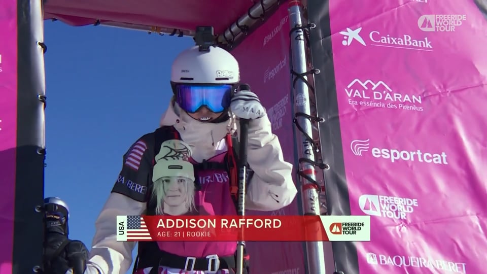 Addison Rafford (USA) couldn’t have kicked off her FWT career any better, claiming victory with a fluid run from top to bottom. She begun with multiple airs from the start of the judging zone, before sending it deep off a cliff into a tight couloir, linking a few turns into a final air with a grab.