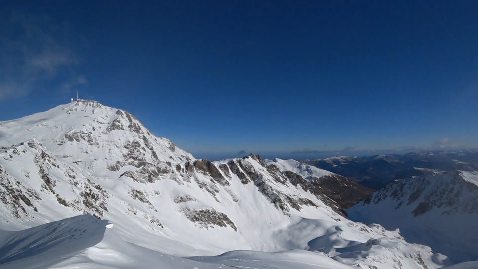 En haut de ce couloir, 10 cm sur un fond de neige béton obligeait à garder beaucoup de retenue... Sur le bas, avec la pente plus douce ça allait mieux. Enfin, retour en haut de Coume Lounque avant de redescendre sur la station de La Mongie.